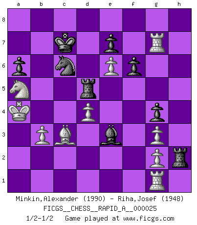 Last move : 1/2-1/2 2007 October 27 18:48:12 [Event "FICGS__CHESS__RAPID_A__000025"] [Site "FICGS"] [Date "2007.09.02"] [Round "1"] [White "Minkin,Alexander"] [Black "Riha,Josef"] [Result "1/2-1/2"] [WhiteElo "1990"] [BlackElo "1948"] 1.e4 c5 2.b3 Nc6 3.Bb2 d6 4.f4 Nf6 5.e5 Nd5 6.Qf3 dxe5 7.fxe5 Be6 8.Qf2 a6 9.Nf3 Bf5 10.Nh4 Bxc2 11.Bc4 g5 12.Na3 Bg6 13.Nxg6 hxg6 14.e6 f6 15.Qxc5 Ndb4 16.Bc3 g4 17.Be2 Nd3+ 18.Bxd3 Qxd3 19.O-O-O O-O-O 20.Nc4 Rh5 21.Qf2 Bh6 22.Kb2 Rf5 23.Qg3 Qxg3 24.hxg3 Bg5 25.Kb1 Kb8 26.d4 Kc7 27.Rh7 Rfd5 28.Rg7 b6 29.a4 Rc8 30.a5 bxa5 31.Rxg6 Rcd8 32.Rg7 Rh8 33.Kb2 Rh2 34.Rg1 Rh8 35.Ka3 Rh5 36.Ka4 Rh2 37.Nxa5 Be3 1/2-1/2 Sicilian defense Queenside Castling by player White (move 19) Queenside Castling by player Black (move 19) This chess game ended in a draw. Follow this game move after move (download)Pawn endings are to Chess what putting is to golf. (Cecil Purdy) Ich weiss nicht was Gott gegen mich auf 1.e4 antworten würde. (Robert James Fischer) Solo existe una cosa que Fischer hace en el Ajedrez sin placer: ¡perder!. (Boris Spassky) Si le désir cupide (et stupide) de gagner est une inépuisable source de souffrance, une combinaison brillante sur l'échiquier est une découverte : le coquelicot qui s'épanouit lorsque apparaît la Voie Lactée. (Arrabal) The arrogant army will lose certainly the battle. (Chinese proverb)