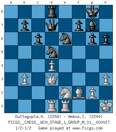Last move : 1/2-1/2 2023 October 9 21:20:32 [Event "FICGS__CHESS__WCH_STAGE_1_GROUP_M_01__000027"] [Site "FICGS"] [Date "2023.07.04"] [Round "1"] [White "Duttagupta,Aniruddha"] [Black "Ambos,Ilmar"] [Result "1/2-1/2"] [WhiteElo "2258"] [BlackElo "2244"] 1.d4 d5 2.c4 e6 3.Nc3 Nf6 4.cxd5 exd5 5.Bg5 c6 6.Qc2 h6 7.Bh4 g6 8.e3 Bf5 9.Bd3 Bxd3 10.Qxd3 Nbd7 11.Nge2 Bg7 12.f3 O-O 13.O-O Re8 14.Rae1 Rc8 15.Qd2 a5 16.h3 Nb6 17.b3 a4 18.Nc1 axb3 19.axb3 Qd6 20.Bf2 Nh7 21.e4 dxe4 22.fxe4 Rcd8 23.N1e2 Qb4 24.Qc2 Ng5 25.Rd1 Ne6 26.Na2 Qb5 27.Kh1 Rd7 28.Nac3 Qb4 29.e5 Nd5 30.Ne4 Red8 31.Nd6 Rxd6 32.exd6 Qxd6 33.Rfe1 Qd7 34.Qd3 1/2-1/2 Follow this game move after move (download)The laws of Chess do not permit a free choice: you have to move whether you like it or not. (Emanuel Lasker) Taktik ist was man tun muß, wenn etwas zu tun ist. Strategie ist was man tun muß, wenn nichts zu tun ist. (Savielly Grigorievitsch Tartakower) Desconfianza es la característica mas necesaria de un jugador de Ajedrez. (Siegbert Tarrasch) Les sacrifices démontrent seulement que quelqu'un a gaffé. (Savielly Tartacover) You can't play chess if you're groggy from pills. (Anatoly Karpov)