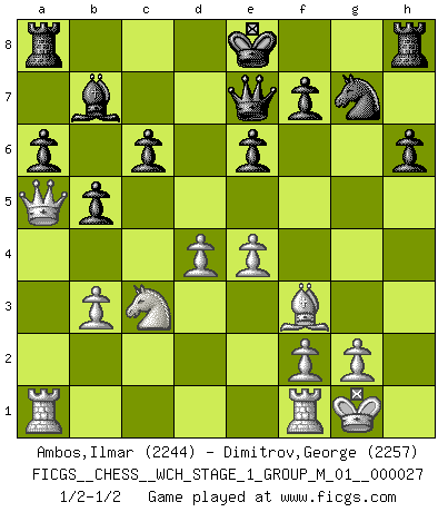 Last move : 1/2-1/2 2023 August 14 17:21:21 [Event "FICGS__CHESS__WCH_STAGE_1_GROUP_M_01__000027"] [Site "FICGS"] [Date "2023.07.04"] [Round "1"] [White "Ambos,Ilmar"] [Black "Dimitrov,George"] [Result "1/2-1/2"] [WhiteElo "2244"] [BlackElo "2257"] 1.d4 d5 2.c4 c6 3.Nc3 Nf6 4.Nf3 e6 5.Bg5 h6 6.Bh4 dxc4 7.e4 g5 8.Bg3 b5 9.h4 g4 10.Ne5 Nbd7 11.Be2 Bb7 12.Nxd7 Qxd7 13.Be5 Qe7 14.b3 cxb3 15.axb3 a6 16.O-O Bg7 17.Qc1 Nh5 18.Bxg7 Nxg7 19.Bxg4 Qxh4 20.Bf3 Qg5 21.Qa3 Qe7 22.Qa5 Qd8 23.Qb4 Qe7 24.Qa5 1/2-1/2 Follow this game move after move (download)Chess is like war on a board. (Bobby Fischer) Zeige mir drei Eröffnungsvarianten und ich beweise dir, dass zwei davon inkorrekt sind. (Emanuel Lasker) Aunque la mayoría de la gente disfruta observar las partidas de los grandes Maestros de ataque, algunos de los jugadores mas notables en la historia han sido los jugadores silenciosos posicionales. Lentamente ellos te aplastan despojandote de tu espacio, congestionando tus piezas y dejandote virtualmente sin nada que hacer. (Yasser Seirawan) Il n'y a plus de joueurs du niveau de Jacob Murray dont la seule quête est le beau jeu, le plaisir de voir les pièces construire quelque chose. Sur 10 idées à la minute, 9 seront sans intérêt, la dernière s'avèrera géniale. (Christian Bauer) No man has ever achieved immortality in his own life time. (Unknown)