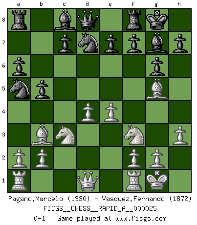 Last move : 0-1 2007 October 11 15:10:32 [Event "FICGS__CHESS__RAPID_A__000025"] [Site "FICGS"] [Date "2007.09.02"] [Round "1"] [White "Pagano,Marcelo"] [Black "Vasquez,Fernando"] [Result "0-1"] [WhiteElo "1930"] [BlackElo "1872"] 1.d4 d5 2.c4 dxc4 3.Nf3 Nf6 4.e3 g6 5.Bxc4 Bg7 6.O-O Nc6 7.Nc3 O-O 8.h3 a6 9.e4 b5 10.Bb3 Nd7 11.Bg5 Na5 0-1 Comment by player 1 : Marcelo Pagano : Querido Fernando! Te regalé un punto ya que no era mi intención abandonar, pero me confundí de partida. Ademas me cansé de jugar contra maquinas! Asi que de todas maneras suerte! Un abrazo! Marcelo QGA, Smyslov variation Kingside Castling by player White (move 6) Kingside Castling by player Black (move 7) Player Black won this chess game. Follow this game move after move (download)Fischer sacrificed virtually everything most of us weakies (to use his term) value, respect, and cherish, for the sake of an artful, often beautiful board game, for the ambivalent privilege of being its greatest master. (Paul Kollar) Mit sehr nachdenklichem Gesicht schreitet Bobby durch den Turniersaal. Was ist passiert?, fragt Lombardy. Ich stehe schlecht, antwortet Fischer. Lombardy: Dann biete doch einfach Remis an. Fischer: So schlecht stehe ich nun auch wieder nicht! (Robert James Fischer) Con el tiempo, empecé a progresar en partidas decisivas. Tal vez porque me di cuenta de una simple verdad: no solo estaba yo nervioso sino también mi oponente. (Mikhail Tal) J'apprécie les joueurs d'est-indienne, c'est grâce à eux que je nourris ma famille depuis tant d'années. (Petrosian) We need strong personalities and only one world champion to attract sponsors. (Anatoly Karpov)