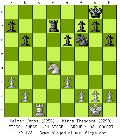 Last move : 1/2-1/2 2023 July 29 13:21:34 [Event "FICGS__CHESS__WCH_STAGE_1_GROUP_M_02__000027"] [Site "FICGS"] [Date "2023.07.04"] [Round "1"] [White "Helmer,Janos"] [Black "Mirra,Theodore"] [Result "1/2-1/2"] [WhiteElo "2256"] [BlackElo "2299"] 1.Nf3 d5 2.d4 Nf6 3.c4 e6 4.Nc3 c6 5.Bg5 h6 6.Bxf6 Qxf6 7.e3 Nd7 8.Be2 Qd8 9.Qc2 Be7 10.O-O O-O 11.a3 b6 12.Rfd1 Ba6 13.Nd2 Rc8 14.Rac1 Nf6 15.Qa4 Bxc4 16.Bxc4 dxc4 17.Qxc4 c5 18.Nf3 cxd4 19.Qa6 Rc7 20.Nxd4 Qc8 21.Qxc8 Rfxc8 22.Ndb5 Rb7 23.Nd5 Rxc1 24.Nxe7+ Rxe7 25.Rxc1 Rd7 26.Nd4 1/2-1/2 Follow this game move after move (download)Bobby is the finest Chess player this country ever produced. His memory for the moves, his brilliance in dreaming up combinations, and his fierce determination to win are uncanny. (John Collins) Die westlichen Werte sind eine Sprache, welche die Putin-Administration nicht versteht. (Garry Kasparov) El jugador táctico sabe que hacer cuando hay algo que hacer; mientras que el estratega sabe que hacer cuando no hay nada que hacer. (Gerald Abrahams) Mais n'est-ce pas déjà le limiter injurieusement que d'appeler les échecs un jeu? N'est-ce pas aussi une science, un art, ou quelque chose qui, comme le cercueil de Mahomet entre ciel et terre, est suspendu entre l'un et l'autre, et qui réunit un nombre incroyable de contraires ? (Stefan Zweig) To err is human, to shift the blame on someone else is tactical. (Mladen Jankovic)
