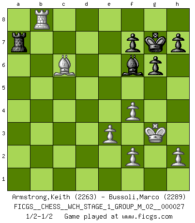 Last move : 1/2-1/2 2023 September 24 3:39:56 [Event "FICGS__CHESS__WCH_STAGE_1_GROUP_M_02__000027"] [Site "FICGS"] [Date "2023.07.04"] [Round "1"] [White "Armstrong,Keith"] [Black "Bussoli,Marco"] [Result "1/2-1/2"] [WhiteElo "2263"] [BlackElo "2289"] 1.Nf3 Nf6 2.c4 c5 3.Nc3 d5 4.cxd5 Nxd5 5.d4 Nxc3 6.bxc3 g6 7.e3 Bg7 8.Bb5+ Bd7 9.Be2 Bc6 10.O-O O-O 11.Ba3 cxd4 12.cxd4 Re8 13.Qb3 e6 14.Rfc1 a6 15.Bb4 Bd5 16.Bc4 Bxf3 17.gxf3 Nc6 18.Be1 b5 19.Bf1 Ne7 20.a4 Nf5 21.axb5 axb5 22.Qxb5 Nh4 23.f4 Nf3+ 24.Kg2 Rxa1 25.Rxa1 Nxe1+ 26.Rxe1 Qa8+ 27.Kg3 Rb8 28.Qa6 Qh1 29.Qa5 Qc6 30.Qc5 Qa8 31.Rc1 Bf6 32.Qc7 Kg7 33.Bg2 Qa3 34.Rc6 Rb3 35.Rxe6 Rc3 36.Bc6 Bxd4 37.Re7 Qb3 38.Qd6 Bf6 39.Re8 Qa3 40.Qxa3 Rxa3 41.Rb8 Ra7 1/2-1/2 Follow this game move after move (download)With or without the title, Bobby Fischer was unquestionably the greatest player of his time. (Burt Hochberg) Ich verachte die Medien. (Robert James Fischer) Yo adoro todas la posiciones. Denme una partida posicional difícil, y la jugaré. Pero posiciones totalmente ganadas, no las tolero. (Hein Donner) Les échecs sont utiles à l'exercice de la faculté de penser et à celle de l'imagination. Car nous devons posséder une méthode élaborée pour atteindre des buts partout où nous devons conduire notre raison. (Leibnitz) There is no vagueness without wind. (Chinese proverb)