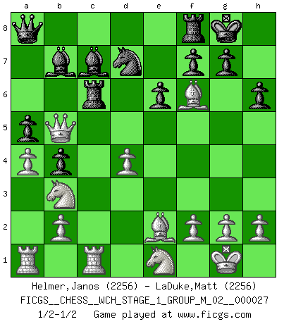 Last move : 1/2-1/2 2023 August 12 0:50:9 [Event "FICGS__CHESS__WCH_STAGE_1_GROUP_M_02__000027"] [Site "FICGS"] [Date "2023.07.04"] [Round "1"] [White "Helmer,Janos"] [Black "LaDuke,Matt"] [Result "1/2-1/2"] [WhiteElo "2256"] [BlackElo "2256"] 1.Nf3 d5 2.d4 e6 3.c4 Nf6 4.Bg5 dxc4 5.Qa4+ Nbd7 6.e3 Be7 7.Bxc4 h6 8.Bh4 a6 9.O-O O-O 10.Qc2 b5 11.Be2 Bb7 12.Rd1 Rc8 13.a4 b4 14.Nbd2 c5 15.Qd3 cxd4 16.exd4 a5 17.Rdc1 Rc6 18.Qb5 Qa8 19.Nb3 Bd8 20.Ne1 Bc7 21.Bxf6 1/2-1/2 Follow this game move after move (download)To avoid losing a piece, many a person has lost the game. (Savielly Tartakover) Wer wird heute Abend ihr Gegner sein? -- Heute Abend spiele ich gegen die schwarzen Steine. (Akiba Rubinstein) Tu puedes aprender mucho mas de una partida que pierdas que de una partida ganada. Tendras que perder cientos de partidas antes de llegar a ser un buen jugador. (Jose Raul Capablanca) Des combinaisons [dans le jeu d'échecs] pareilles à des mélodies. Je crois entendre pour ainsi dire la musique des coups... (Vladimir Nabokov) Hold em is to stud what chess is to checkers. (Johnny Moss)