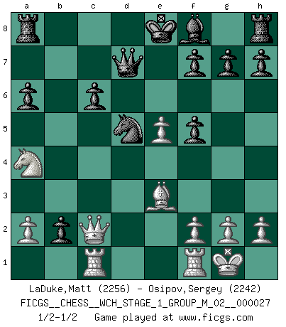 Last move : 1/2-1/2 2023 July 19 3:34:29 [Event "FICGS__CHESS__WCH_STAGE_1_GROUP_M_02__000027"] [Site "FICGS"] [Date "2023.07.04"] [Round "1"] [White "LaDuke,Matt"] [Black "Osipov,Sergey"] [Result "1/2-1/2"] [WhiteElo "2256"] [BlackElo "2242"] 1.e4 c6 2.d4 d5 3.e5 Bf5 4.Nf3 e6 5.Be2 c5 6.Be3 cxd4 7.Nxd4 Ne7 8.O-O Nbc6 9.Bb5 a6 10.Bxc6+ bxc6 11.c4 Qd7 12.Nc3 dxc4 13.Na4 Nd5 14.Nxf5 exf5 15.Rc1 c3 16.Qc2 cxb2 1/2-1/2 Follow this game move after move (download)Chess is a matter of delicate judgment, knowing when to punch and how to duck. (Bobby Fischer) Nie in meinem Leben habe ich die französische Verteidigung gespielt, welche die Stumpfsinnigste von allen ist. (Wilhelm Steinitz) Yo considero que Fischer es uno de los expertos mas grandes de aperturas de siempre. (Keith Hayward) Avec des compensations pour le matériel en plus... (Anonyme) Ah, beer! The cause of, and the solution to, all of life's problems. (Homer Simpson)
