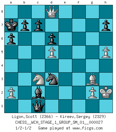 Last move : 1/2-1/2 2023 July 16 7:3:9 [Event "FICGS__CHESS__WCH_STAGE_1_GROUP_SM_01__000027"] [Site "FICGS"] [Date "2023.07.04"] [Round "1"] [White "Ligon,Scott"] [Black "Kireev,Sergey"] [Result "1/2-1/2"] [WhiteElo "2366"] [BlackElo "2329"] 1.e4 e5 2.f4 exf4 3.Bc4 Qh4+ 4.Kf1 Nf6 5.Nf3 Qh6 6.Nc3 d6 7.d4 Be7 8.Kg1 Be6 9.Bd3 Nh5 10.Ne1 g6 11.Be2 Qg7 12.d5 Bd7 13.Bxh5 gxh5 14.h3 Na6 15.Nd3 Rg8 16.Qf3 O-O-O 17.Bxf4 Bh4 18.Kh2 Rde8 19.Rhg1 f5 20.exf5 Bxf5 21.Qxh5 Bxd3 22.Qxh4 Bxc2 23.Bh6 Qe5+ 24.Bf4 Qg7 25.Bh6 Qe5+ 26.Bf4 Qd4 27.Rae1 Bg6 28.Rxe8+ Rxe8 29.Rd1 Qb4 30.Qf2 Nc5 31.Bg3 Qb6 32.h4 Kb8 33.Qf3 a6 34.h5 Bc2 35.Rd2 Qxb2 36.Qf6 Nd3 37.Qf7 Rc8 38.Qf6 Qc1 39.Re2 Rg8 40.Qf7 Rc8 41.Re8 Rxe8 42.Qxe8+ Ka7 43.Qd8 1/2-1/2 Follow this game move after move (download)All Chess players should have a hobby. (Savielly Tartakower) Gegen einen Schachcomputer zu verlieren ist wie Löcher in den Strümpfen zuhaben. Es ist nicht peinlich, solange man der einzige ist der es weiß. (Anonymous) Bobby solo arroja las piezas y solas caen en las casillas correctas. (Miguel Najdorf ) Les erreurs sont comme les malheurs, elles n'arrivent jamais seules. (Siegbert Tarrasch) Computer Science is no more about computers than astronomy is about telescopes. (Edsger W. Dijkstra)