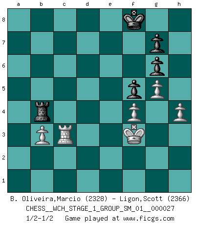 Last move : 1/2-1/2 2023 August 17 3:54:9 [Event "FICGS__CHESS__WCH_STAGE_1_GROUP_SM_01__000027"] [Site "FICGS"] [Date "2023.07.04"] [Round "1"] [White "B. Oliveira,Marcio"] [Black "Ligon,Scott"] [Result "1/2-1/2"] [WhiteElo "2328"] [BlackElo "2366"] 1.d4 d5 2.c4 e5 3.dxe5 d4 4.Nf3 Nc6 5.Nbd2 Nge7 6.Nb3 Ng6 7.a3 Be7 8.Nbxd4 Ncxe5 9.Qc2 O-O 10.e3 c5 11.Nxe5 cxd4 12.Nxg6 hxg6 13.Bd3 dxe3 14.Bxe3 Qa5+ 15.Qd2 Qe5 16.O-O Rd8 17.Qc2 Bf6 18.Rab1 Rxd3 19.Qxd3 Bf5 20.Qd5 Qxd5 21.cxd5 Bxb1 22.Rxb1 b6 23.g4 Re8 24.g5 Be5 25.Kg2 Kf8 26.b3 Bd6 27.Kf3 Bxa3 28.Ra1 Bc5 29.Bxc5+ bxc5 30.Rxa7 Re5 31.d6 Ke8 32.Rc7 Rd5 33.Ke4 Rxd6 34.Rxc5 Rb6 35.Rc3 Rb5 36.f4 f6 37.h4 Rb4+ 38.Kf3 f5 39.Rc8+ Kf7 40.Rc7+ Kf8 41.Rc3 1/2-1/2 Follow this game move after move (download)Not only will I predict his triumph over Botvinnik, but I'll go further and say that he'll probably be the greatest Chess player that ever lived. (John Collins) Wer der Ansicht ist, daß alle Schachspieler verrückt sind, wird durch Studium des Lebens von Emil Josef Diemer nicht auf andere Gedanken kommen. (Hans Ree) Una mala movida nulifica cuarenta buenas. (Horowitz) Vous m'avez demandé de vous exposer quel est le fondement de la prière. Je ne fais que préparer les pièces du jeu sur la table... Nous sera-t-il permis d'en adopter les règles et si nous les appliquons scrupuleusement nous ne tarderons pas à faire mat le Roi divin ! Il ne pourra échapper à nos mains. (Sainte Thérèse d'Avila, Chemin de perfection) History is the quarrels of popes and kings, with wars or pestilences in every page; the men all so good for nothing, and hardly any women at all. (Jane Austen)