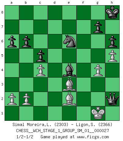Last move : 1/2-1/2 2023 September 6 17:6:28 [Event "FICGS__CHESS__WCH_STAGE_1_GROUP_SM_01__000027"] [Site "FICGS"] [Date "2023.07.04"] [Round "1"] [White "Simal Moreira,Leonardo"] [Black "Ligon,Scott"] [Result "1/2-1/2"] [WhiteElo "2303"] [BlackElo "2366"] 1.e4 Nf6 2.e5 Nd5 3.c4 Nb6 4.d4 d6 5.f4 dxe5 6.fxe5 Nc6 7.Be3 Bf5 8.Nc3 e6 9.Be2 Be7 10.Nf3 f6 11.O-O O-O 12.exf6 Bxf6 13.Qd2 h6 14.Rad1 Qe8 15.h3 Rd8 16.Qe1 Kh8 17.Kh1 Bc2 18.Rd2 Bh7 19.Bg1 a6 20.Qg3 e5 21.d5 Ne7 22.Qe1 Na4 23.Nxa4 Qxa4 24.Bh2 e4 25.Nd4 e3 26.Rd1 Bxd4 27.Rxd4 Rxf1+ 28.Qxf1 Nf5 29.Rg4 Rd7 30.Kg1 Rf7 31.Qc1 Qe8 32.Qe1 Re7 33.Rf4 Bg6 34.Bg4 Rf7 35.Be2 c6 36.g4 Nd6 37.Rxf7 Nxf7 38.d6 Ng5 39.Qf1 c5 40.Bf4 b6 41.h4 Ne6 42.h5 Be4 43.Bxe3 Qd8 44.Qf2 Qxd6 45.Qh2 Qxh2+ 1/2-1/2 Follow this game move after move (download)That's what Chess is all about. One day you give your opponent a lesson, the next day he gives you one. (Bobby Fischer) Karpov ist ein Museumsstück. (Garry Kasparov) Desconfianza es la característica mas necesaria de un jugador de Ajedrez. (Siegbert Tarrasch) Il a essayé de se convaincre qu'il pourrait empêcher toutes les erreurs et ne jamais perdre. L'horreur ! Gary Kasparov au sujet de Robert Fischer. The only thing that matters is the evidence. (Horatio Caine, C.S.I. Miami)
