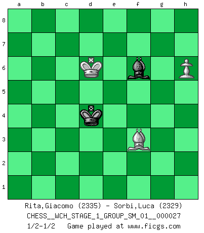 Last move : 1/2-1/2 2023 December 9 15:46:33 [Event "FICGS__CHESS__WCH_STAGE_1_GROUP_SM_01__000027"] [Site "FICGS"] [Date "2023.07.04"] [Round "1"] [White "Rita,Giacomo"] [Black "Sorbi,Luca"] [Result "1/2-1/2"] [WhiteElo "2335"] [BlackElo "2329"] 1.e4 c5 2.Nf3 d6 3.d4 cxd4 4.Nxd4 Nf6 5.Nc3 a6 6.h3 e5 7.Nde2 h5 8.g3 Be7 9.Bg2 b5 10.Nd5 Nxd5 11.Qxd5 Ra7 12.Be3 Rb7 13.b3 Nd7 14.Qd2 Rc7 15.O-O Bb7 16.Rac1 Qa8 17.Nc3 f5 18.Nd5 Bxd5 19.exd5 O-O 20.c4 bxc4 21.Rxc4 Rxc4 22.bxc4 Qd8 23.c5 Nxc5 24.Qe2 g6 25.Bxc5 dxc5 26.Qxe5 Bd6 27.Qe2 Qf6 28.Bf3 Kg7 29.Re1 h4 30.gxh4 Qxh4 31.Qxa6 Qf4 32.Re6 Qc1+ 33.Kg2 Qg5+ 34.Kf1 Qc1+ 35.Kg2 Qg5+ 36.Kf1 Qc1+ 37.Re1 Qf4 38.Qb7+ Kh8 39.Qb3 Rb8 40.Qe3 Qh4 41.Kg2 c4 42.Be2 Kh7 43.Rc1 Rb4 44.a3 Rb3 45.Rxc4 Qxc4 46.Bxc4 Rxe3 47.fxe3 Bxa3 48.Kf3 Kg7 49.Bb5 Kf6 50.e4 Ke5 51.exf5 gxf5 52.d6 Bxd6 53.Ba4 Kd4 54.Kf2 f4 55.h4 f3 56.Bd1 Bf8 57.Kg3 Ke4 58.Bxf3+ Kd4 59.Kf4 Be7 60.h5 Bf6 61.h6 Bh8 62.Kf5 Kc5 63.Ke6 Kd4 64.Kd6 Bf6 1/2-1/2 Follow this game move after move (download)A big shock; the best chess player in history has passed away. (Lajos Portisch, about Bobby Fischer's death) Ich moechte nie einem Club beitreten, der Leute wie mich als Mitglieder aufnimmt. (Woody Allen) No hay un Gran Maestro de Ajedrez que sea normal; solo se diferencían ellos por la magnitud de su locura. (Viktor Korchnoi) La guerre est enfant de la passion, la passion est enfant du narcissisme et le narcissisme est l'enfant. (...) Une autre partie ? (Thibault de Vassal) Man with more than one clock never knows what time it is. (Chinese thought)