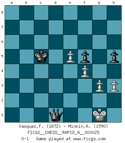Last move : 0-1 2008 February 20 3:14:12 [Event "FICGS__CHESS__RAPID_A__000025"] [Site "FICGS"] [Date "2007.09.02"] [Round "1"] [White "Vasquez,Fernando"] [Black "Minkin,Alexander"] [Result "0-1"] [WhiteElo "1872"] [BlackElo "1990"] 1.e4 c6 2.d4 d5 3.e5 Bf5 4.Nc3 e6 5.Bd3 Bxd3 6.Qxd3 Nd7 7.Nf3 Ne7 8.O-O a6 9.Bg5 h6 10.Be3 Nf5 11.Ne2 Be7 12.c3 Rc8 13.Bd2 c5 14.Rac1 O-O 15.Nf4 Nb8 16.b4 cxb4 17.cxb4 Qd7 18.a4 Rfd8 19.Rxc8 Rxc8 20.b5 Rc4 21.Ra1 Nh4 22.Nxh4 Bxh4 23.Ne2 Qc7 24.f4 Nd7 25.g3 Bd8 26.Kg2 f5 27.bxa6 bxa6 28.h3 Nf8 29.a5 Ng6 30.Rb1 Ne7 31.Kf2 h5 32.Rg1 Qc8 33.Rd1 g6 34.Rb1 Kf7 35.Rg1 Kg7 36.Kf3 Ra4 37.Rc1 Nc6 38.Ke3 Qb7 39.Rb1 Qa7 40.Kf2 Kf7 41.Rb2 Nxa5 42.Qb1 Qc7 43.Bxa5 Qxa5 44.Rb7+ Ke8 45.Rg7 Ra1 46.Qb2 Bb6 47.Rxg6 Bxd4+ 48.Qxd4 Qe1+ 49.Kf3 Ra3+ 50.Kg2 Qxe2+ 51.Qf2 Qe4+ 52.Kh2 Re3 53.Rxe6+ Kd7 54.Rxa6 Re2 55.Rd6+ Kc7 56.Kg1 Rxf2 57.Kxf2 d4 58.Rf6 d3 59.Rf7+ Kc6 60.Rf8 d2 61.Rf6+ Kc5 62.Rd6 Qe1+ 63.Kg2 Qe2+ 64.Kg1 d1Q+ 65.Rxd1 Qxd1+ 0-1 Caro-Kann : Advance variation Kingside Castling by player White (move 8) Kingside Castling by player Black (move 14) Promotion Queen by player Black (move 64) 10 pieces endgame at move 65 : White KRPPPP , Black KQPP WHITE : King + 1 Rook 4 Pawns BLACK : King + 1 Queen 2 Pawns 9 pieces endgame at move 65 : White KPPPP , Black KQPP WHITE : King + 4 Pawns BLACK : King + 1 Queen 2 Pawns Player Black won this chess game. Follow this game move after move (download)There is only one thing Fischer does in Chess without pleasure: to lose ! (Boris Spassky) Zu meiner Zeit war ein 20 jähriger ein junger Spieler, heute ist er ein Veteran. (Garry Kasparov) Solo puedes ser bueno en el Ajedrez si amas al juego. (Bobby Fischer) On peut tirer plus d'utilité d'une partie perdue que de 100 parties gagnées. (Capablanca) Establishing goals is all right if you don't let them deprive you of interesting detours. (Doug Larson)