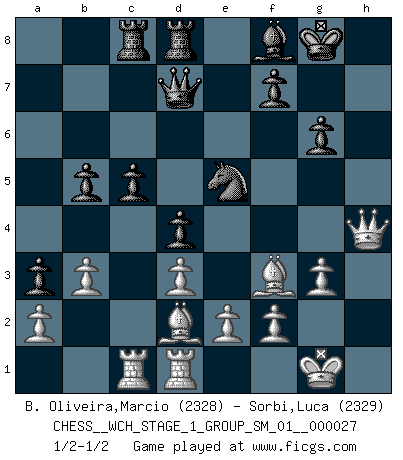 Last move : 1/2-1/2 2023 September 19 11:13:55 [Event "FICGS__CHESS__WCH_STAGE_1_GROUP_SM_01__000027"] [Site "FICGS"] [Date "2023.07.04"] [Round "1"] [White "B. Oliveira,Marcio"] [Black "Sorbi,Luca"] [Result "1/2-1/2"] [WhiteElo "2328"] [BlackElo "2329"] 1.Nf3 Nf6 2.c4 e6 3.g3 d5 4.Bg2 dxc4 5.Qa4+ Bd7 6.Qxc4 c5 7.Ne5 Qc8 8.Nxd7 Qxd7 9.Nc3 Nc6 10.O-O Be7 11.d3 Rc8 12.Qa4 O-O 13.Bd2 Rfd8 14.Rfd1 a6 15.Rac1 Nd5 16.Nxd5 exd5 17.Be3 b5 18.Qf4 d4 19.Bd2 a5 20.h4 a4 21.h5 g6 22.hxg6 hxg6 23.b3 a3 24.Qh6 Ne5 25.Bf3 Bf8 26.Qh4 1/2-1/2 Follow this game move after move (download)Every Pawn is a potential Queen. (James Mason) Schach wird sich dank seiner hohen kulturellen Tradition immer durchsetzen. In näherer Zukunft womöglich sogar als Gegenreaktion auf die maßlose Reizüberflutung im Freizeit- und Spielbereich. (Garry Kasparov) El Ajedrez es como la guerra en un tablero. (Bobby Fischer) Vouloir jouer aux échecs contre soi-même est aussi paradoxal que vouloir marcher sur son ombre. (Stefan Zweig) It's only after you lost everything, Tyler says, that you're free to do anything. (Chuck Palahniuk, Fight Club)