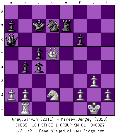 Last move : 1/2-1/2 2023 July 18 9:0:57 [Event "FICGS__CHESS__WCH_STAGE_1_GROUP_SM_01__000027"] [Site "FICGS"] [Date "2023.07.04"] [Round "1"] [White "Gray,Garvin"] [Black "Kireev,Sergey"] [Result "1/2-1/2"] [WhiteElo "2311"] [BlackElo "2329"] 1.d4 Nf6 2.Nf3 d5 3.c4 c6 4.Nc3 e6 5.Bg5 dxc4 6.e4 b5 7.e5 h6 8.Bh4 g5 9.Nxg5 hxg5 10.Bxg5 Nbd7 11.exf6 Bb7 12.g3 c5 13.d5 Qb6 14.Bg2 O-O-O 15.O-O b4 16.Rb1 Qa6 17.dxe6 Bxg2 18.e7 Bxf1 19.Kxf1 Bxe7 20.fxe7 Rdg8 21.Ne4 Rxg5 22.Nxg5 Re8 23.Qd5 Rxe7 24.Kg1 f6 25.Ne4 Kc7 26.Nd2 1/2-1/2 Follow this game move after move (download)You may learn much more from a game you lose than from a game you win. You will have to lose hundreds of games before becoming a good player. (Jose Raul Capablanca) Ich verachte die Medien. (Robert James Fischer) Yo adoro todas la posiciones. Denme una partida posicional difícil, y la jugaré. Pero posiciones totalmente ganadas, no las tolero. (Hein Donner) Votre prénom est 'Tactique', votre deuxième prénom est 'Tactique' et votre nom est 'Tactique'. (Ken Smith) Everybody lies. (Gregory House, House M.D.)