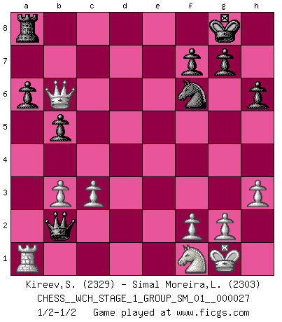 Last move : 1/2-1/2 2023 August 1 8:17:56 [Event "FICGS__CHESS__WCH_STAGE_1_GROUP_SM_01__000027"] [Site "FICGS"] [Date "2023.07.04"] [Round "1"] [White "Kireev,Sergey"] [Black "Simal Moreira,Leonardo"] [Result "1/2-1/2"] [WhiteElo "2329"] [BlackElo "2303"] 1.e4 e5 2.Nf3 Nc6 3.Bb5 Nf6 4.d3 Bc5 5.Ba4 a6 6.c3 b5 7.Bb3 d6 8.O-O O-O 9.Nbd2 h6 10.Re1 Bb6 11.Nf1 Re8 12.h3 Be6 13.Be3 d5 14.exd5 Bxd5 15.Bxb6 cxb6 16.d4 exd4 17.Rxe8+ Qxe8 18.Nxd4 Nxd4 19.Qxd4 Bxb3 20.axb3 Qe2 21.Qxb6 Qxb2 1/2-1/2 Follow this game move after move (download)The stomach is an essential part of the Chess master. (Bent Larsen) Über Kasparov: Es ist offensichtlich, daß er in einem totalitären Staat aufwuchs und deshalb zu diktatorischen Zügen neigt. (Viktor Kortschnoi) Diferente gente reacciona diferentemente en aceptar la derrota. (Bobby Fischer) Si le désir cupide (et stupide) de gagner est une inépuisable source de souffrance, une combinaison brillante sur l'échiquier est une découverte : le coquelicot qui s'épanouit lorsque apparaît la Voie Lactée. (Arrabal) The faster the computer, the slower the brain. (Thibault de Vassal)