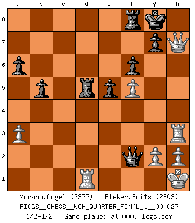 Last move : 1/2-1/2 2023 September 4 21:59:37 [Event "FICGS__CHESS__WCH_QUARTER_FINAL_1__000027"] [Site "FICGS"] [Date "2023.07.04"] [Round "4"] [White "Morano,Angel"] [Black "Bleker,Frits"] [Result "1/2-1/2"] [WhiteElo "2377"] [BlackElo "2503"] 1.e4 c5 2.Nf3 d6 3.d4 cxd4 4.Nxd4 Nf6 5.Nc3 a6 6.Be3 e5 7.Nb3 Be6 8.f3 h5 9.Be2 Nbd7 10.f4 Qc7 11.f5 Bc4 12.O-O b5 13.a3 Be7 14.Nd2 Bxe2 15.Qxe2 O-O 16.Rf3 d5 17.Rh3 Bc5 18.Nxd5 Nxd5 19.exd5 Bxe3+ 20.Qxe3 Nf6 21.Re1 Qxc2 22.Qg5 Qxb2 23.Rg3 Qd4+ 24.Kh1 Ng4 25.Ne4 f6 26.Qxh5 Nf2+ 27.Nxf2 Qxf2 28.Rd1 Rad8 29.Rh3 Rxd5 30.Qh7+ Kf7 31.Qg6+ Kg8 32.Qh7+ Kf7 33.Qg6+ Kg8 34.Qh7+ 1/2-1/2 Follow this game move after move (download)We must make sure that Chess will not be like a dead language, very interesting, but for a very small group. (Sytze Faber) Kein Großmeister ist normal. Sie unterscheiden sich nur im Ausmaß Ihrer Verrücktheit. (Viktor Kortschnoi) Tu sabes, camarada Pachman, no disfruto el ser un Ministro, preferería jugar al Ajedrez como tu. (Che Guevara) Des points faibles ou des trous dans la position de l'adversaire doivent être occupés par des pièces et non pas par des pions. (Siegbert Tarrasch) As the days dwindle down... to a precious few. (Maxwell Anderson)