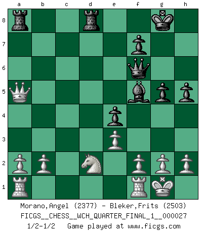 Last move : 1/2-1/2 2023 September 5 9:1:10 [Event "FICGS__CHESS__WCH_QUARTER_FINAL_1__000027"] [Site "FICGS"] [Date "2023.07.04"] [Round "8"] [White "Morano,Angel"] [Black "Bleker,Frits"] [Result "1/2-1/2"] [WhiteElo "2377"] [BlackElo "2503"] 1.d4 d5 2.Nf3 Nf6 3.c4 e6 4.Nc3 Bb4 5.cxd5 exd5 6.Bg5 h6 7.Bh4 O-O 8.e3 Bf5 9.Qb3 Bxc3+ 10.Qxc3 g5 11.Bg3 Ne4 12.Qa3 Re8 13.Bd3 h5 14.Bxe4 dxe4 15.Qc5 Qf6 16.Nd2 Nd7 17.Qa3 c5 18.dxc5 b6 19.Bd6 bxc5 20.Bxc5 Nxc5 21.Qxc5 Rac8 22.Qb4 Red8 23.O-O a5 24.Qxa5 Ra8 25.Qb4 Rab8 26.Qa5 Ra8 27.Qb4 Rab8 28.Qa5 Ra8 1/2-1/2 Follow this game move after move (download)Via the squares on the chessboard, the Indians explain the movement of time and the age, the higher influences which control the world and the ties which link Chess with the human soul. (Al-Masudi) Es ist besser die Steine des Gegners zu opfern. (Savielly Grigorievitsch Tartakower) La vida es como el Ajedrez, con lucha, competición y eventos buenos y malos. (Benjamin Franklin) Donnez-moi un Cavalier en 6e et je gagnerais toutes mes parties. (Steinitz) It is not titles that honor men, but men that honor titles. (Niccolo Machiavelli)