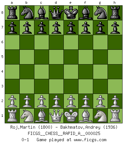 Last move : 0-1 2007 October 2 22:57:56 [Event "FICGS__CHESS__RAPID_A__000025"] [Site "FICGS"] [Date "2007.09.02"] [Round "1"] [White "Roj,Martin"] [Black "Bakhmatov,Andrey"] [Result "0-1"] [WhiteElo "1800"] [BlackElo "1936"] 0-1 This chess game has been lost on time (started : 2007.09.02 18:20:15) Player Black won this chess game. Follow this game move after move (download)If a ruler does not understand Chess, how can he rule over a kingdom ? (King Khusros II) Ein Remis kann durch Wiederholung von drei Zügen oder durch einen schlechte Zug erreicht werden. (Savielly Grigorievitsch Tartakower) Nunca antes ha habido un jugador de Ajedrez con tal conocimiento a fondo de las complejidades del juego y una inmensa voluntad absolutamente indomable de ganar. Yo pienso que Fischer es el jugador mas grande que jamás haya existido. (Lisa Lane) Aux échecs, les retours au sommet sont rares : les dommages psychologiques consécutifs à une défaite sont trop sévères. (Daily Telegraph) They say in chess you've got to kill the queen, and then you mate it... Oh I, do you ? (Red Hot Chili Peppers, Fortune faded)