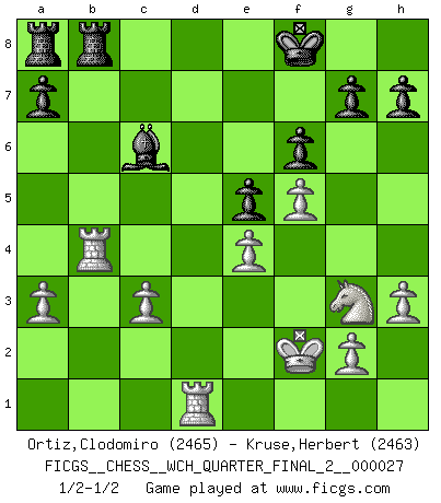 Last move : 1/2-1/2 2023 August 15 9:3:58 [Event "FICGS__CHESS__WCH_QUARTER_FINAL_2__000027"] [Site "FICGS"] [Date "2023.07.04"] [Round "1"] [White "Ortiz,Clodomiro"] [Black "Kruse,Herbert"] [Result "1/2-1/2"] [WhiteElo "2465"] [BlackElo "2463"] 1.d4 Nf6 2.c4 e6 3.Nc3 Bb4 4.e3 c5 5.Nge2 d5 6.a3 Ba5 7.dxc5 dxc4 8.Bd2 O-O 9.Ng3 b6 10.Bxc4 bxc5 11.Qc2 Nbd7 12.Rd1 Qb6 13.O-O Bb7 14.e4 Ne5 15.Be2 c4 16.Bg5 Qb3 17.Qc1 Nfd7 18.Be7 Rfb8 19.f4 Nd3 20.Bxd3 cxd3 21.Rxd3 Nf8 22.Rfd1 Ba6 23.Rd6 Bc4 24.Bxf8 Rxf8 25.f5 f6 26.Rd7 e5 27.h3 Bxc3 28.Qxc3 Qxc3 29.bxc3 Bb5 30.Rb7 Bc6 31.Rb2 Rfb8 32.Rb4 Kf8 33.Kf2 1/2-1/2 Follow this game move after move (download)Chess is above all, a fight ! (Emanuel Lasker) Wenn Spassky eine Figur opfert kannst du genauso gut aufgeben. Aber wenn Tal eine Figur opfert, spiel weiter. Er könnte noch eine weitere opfern, und dann ... wer weiß? (Miguel Najdorf) La batalla por la última verdad nunca sera ganada. Y es por eso que el Ajedrez es tan fascinante. (Hans Kmoch) Les Echecs ont trois composantes : le temps, l'espace et le matériel en dernier. (Mikhail Tal) There's always a bigger fish. (Qui-Gon Jinn in Star Wars ep.1)