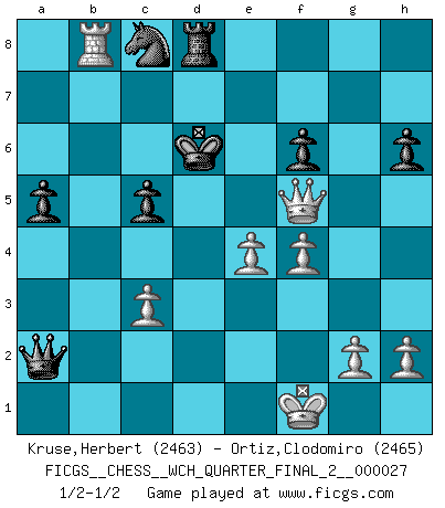 Last move : 1/2-1/2 2023 August 14 22:7:0 [Event "FICGS__CHESS__WCH_QUARTER_FINAL_2__000027"] [Site "FICGS"] [Date "2023.07.04"] [Round "4"] [White "Kruse,Herbert"] [Black "Ortiz,Clodomiro"] [Result "1/2-1/2"] [WhiteElo "2463"] [BlackElo "2465"] 1.d4 d5 2.c4 dxc4 3.e4 e5 4.Nf3 Bb4+ 5.Nc3 exd4 6.Nxd4 Nd7 7.Bxc4 Ngf6 8.f3 O-O 9.Be2 Ne5 10.O-O Qe7 11.Bg5 Bxc3 12.bxc3 c5 13.Nb3 Rd8 14.Qb1 b6 15.f4 Ng6 16.Rf2 h6 17.Bxf6 Qxf6 18.Qc1 a5 19.Qe3 Ne7 20.Nd2 Ba6 21.Bxa6 Rxa6 22.Rb1 Ra7 23.Nc4 Nc8 24.Ne5 Qe6 25.Qf3 b5 26.Rxb5 f6 27.Ng4 Rad7 28.Rb8 Rd1+ 29.Rf1 Rxf1+ 30.Kxf1 Qxa2 31.Nxf6+ gxf6 32.Qg4+ Kf7 33.Qh5+ Ke6 34.Qf5+ Kd6 1/2-1/2 Follow this game move after move (download)There are two types of sacrifices: correct ones and mine. (Mikhail Tal) Wenn sie aufgeben, dann danke ich Ihnen für das Spiel (Eventualzug beim Fernschach). (Anonymous) El Ajedrez es tan interesante por sí solo, que no es necesario un interés monetario para persuadir a una persona a que lo practique; por lo tanto, nunca se juega por dinero. (Benjamin Franklin) Les échecs sont plus proches de l'art de l'assassinat que de l'art de la guerre. (Arturo Perez-Reverte) Who needs drugs and alcohol if he can play Big Chess at FICGS ? (Heinz-Georg Lehnhoff)