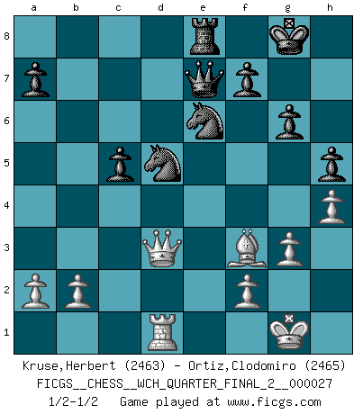Last move : 1/2-1/2 2023 August 15 23:37:51 [Event "FICGS__CHESS__WCH_QUARTER_FINAL_2__000027"] [Site "FICGS"] [Date "2023.07.04"] [Round "6"] [White "Kruse,Herbert"] [Black "Ortiz,Clodomiro"] [Result "1/2-1/2"] [WhiteElo "2463"] [BlackElo "2465"] 1.Nf3 d5 2.g3 Nf6 3.Bg2 c6 4.O-O Bg4 5.h3 Bxf3 6.Bxf3 e5 7.d4 Nbd7 8.c4 dxc4 9.Nd2 exd4 10.Nxc4 Nc5 11.Bf4 Ne6 12.Qb3 Nc5 13.Qd1 Ne6 14.Qb3 Nc5 15.Qc2 Ne6 16.Rfd1 Be7 17.Be5 O-O 18.Rac1 Bc5 19.e3 Nd7 20.Bxd4 Bxd4 21.exd4 Nf6 22.Qd2 Qe7 23.Rc3 Rad8 24.Rd3 Rfe8 25.Qa5 g6 26.h4 h5 27.Ne3 b6 28.Qc3 c5 29.dxc5 Rxd3 30.Qxd3 bxc5 31.Nd5 Nxd5 1/2-1/2 Follow this game move after move (download)When your house is on fire, you can't be bothered with the neighbors. Or, as we say in Chess, if your King is under attack you don't worry about losing a Pawn on the Queen's side. (Gary Kasparov) Kritik überlasse ich den Spießern. Ich zeige nichts, wofür ich mich schämen muss. (Alexandra Kosteniuk) El pensamiento metódico es mas útil en el Ajedrez que la inspiración. (C. J. S. Purdy) Toute estimation doit être constamment réévaluée. (Jacob Estrin) My poor ole parrot... Is not in the circulation of displays ....poo hoo hoo :) (Wayne Lowrance's enigma)