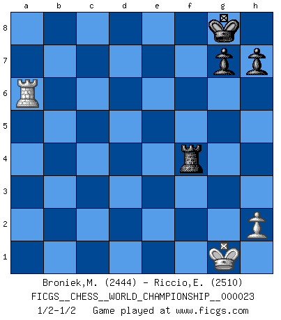Last move : 1/2-1/2 2023 September 29 5:12:18 [Event "FICGS__CHESS__WORLD_CHAMPIONSHIP__000023"] [Site "FICGS"] [Date "2023.07.04"] [Round "8"] [White "Broniek,Mariusz Maciej"] [Black "Riccio,Eros"] [Result "1/2-1/2"] [WhiteElo "2444"] [BlackElo "2510"] 1.d4 d5 2.c4 dxc4 3.e4 e5 4.Nf3 exd4 5.Bxc4 Nc6 6.O-O Be6 7.Bb5 Bc5 8.b4 Bb6 9.a4 a6 10.Bxc6+ bxc6 11.Nbd2 Nf6 12.Ne5 Qd6 13.Nd3 Nd7 14.Nf3 O-O 15.a5 Ba7 16.Qc2 Bg4 17.Nfe1 Qe7 18.f3 Be6 19.Qxc6 Qd6 20.Qc2 c5 21.bxc5 Bxc5 22.f4 f5 23.Nxc5 Qxc5 24.Ba3 Qxa5 25.Qd1 Rf7 26.Qxd4 fxe4 27.Qxe4 Bd5 28.Qd4 Qb6 29.Nc2 Qxd4+ 30.Nxd4 Nb6 31.g4 Nc4 32.Nf5 Nxa3 33.Rxa3 Be6 34.Rfa1 Bxf5 35.gxf5 Rxf5 36.Rxa6 Rxa6 37.Rxa6 Rxf4 1/2-1/2 Follow this game move after move (download)Not all artists are Chess players, but all Chess players are artists. (Marcel Duchamp) Lisa Lane, amerikanische Schachmeisterin, hatte Fischer einmal als stärksten lebenden Spieler bezeichnet. Antwort: Das ist richtig, aber Lisa Lane ist eigentlich nicht in der Lage, das zu beurteilen. (Robert James Fischer) Repentinamente, me resultaba obvio en mi analisis que yo había pasado por alto lo que Fischer había visto en el tablero con la mas grande facilidad. (Mikhail Botvinnik) Aidez vos pièces, elles vous aideront. (Paul Morphy) We cannot be sure of having something to live for unless we are willing to die for it. (Ernesto Che Guevara)