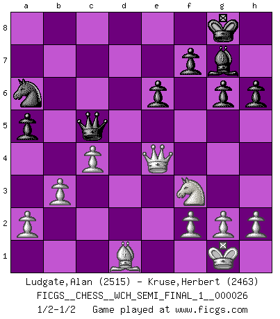 Last move : 1/2-1/2 2023 July 21 7:46:45 [Event "FICGS__CHESS__WCH_SEMI_FINAL_1__000026"] [Site "FICGS"] [Date "2023.07.06"] [Round "3"] [White "Ludgate,Alan"] [Black "Kruse,Herbert"] [Result "1/2-1/2"] [WhiteElo "2515"] [BlackElo "2463"] 1.d4 Nf6 2.c4 c6 3.Nf3 d5 4.Nc3 e6 5.Bg5 h6 6.Bxf6 Qxf6 7.e3 g6 8.Be2 Bg7 9.O-O O-O 10.e4 dxe4 11.Nxe4 Qf4 12.Qc2 c5 13.dxc5 a5 14.Rad1 Bd7 15.Nd6 Na6 16.Qb3 Bc6 17.Qb6 Qg4 18.b3 Qh5 19.Nxb7 Bxb7 20.Qxb7 Qxc5 21.Qe4 Rad8 22.Rxd8 Rxd8 23.Rd1 Rxd1+ 24.Bxd1 1/2-1/2 Follow this game move after move (download)Chess is a fighting game which is purely intellectual and includes chance. (Richard Reti) Ich spiele ehrlich und spiele, um zu gewinnen. Wenn ich verliere nehme ich meine Medizin. (Robert James Fischer) Un Peón pasado es un criminal, quién debe ser mantenido bajo candado y llave. Leves medidas, tales como vigilancia policiaca, no son suficientes. (Aaron Nimzovich) Le moment que je préfère le plus dans une rencontre, c'est celui où je sens que la personnalité de l'adversaire se brise. (Robert Fischer) Be who you are, and say what you feel because those who mind don't matter, and those who matter don't mind. (Dr Seuss)