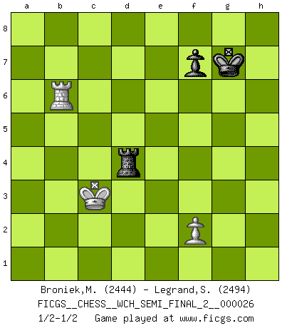Last move : 1/2-1/2 2024 January 2 17:38:7 [Event "FICGS__CHESS__WCH_SEMI_FINAL_2__000026"] [Site "FICGS"] [Date "2023.07.06"] [Round "2"] [White "Broniek,Mariusz Maciej"] [Black "Legrand,Stephane"] [Result "1/2-1/2"] [WhiteElo "2444"] [BlackElo "2494"] 1.d4 Nf6 2.c4 e6 3.Nf3 d5 4.g3 Be7 5.Bg2 O-O 6.O-O dxc4 7.Qc2 a6 8.a4 Bd7 9.Qxc4 Bc6 10.Bf4 Bd6 11.Qc1 Nbd7 12.Re1 Rb8 13.Nc3 b5 14.axb5 axb5 15.Rd1 Qc8 16.Ne5 Bxg2 17.Kxg2 b4 18.Nb1 Bxe5 19.Bxe5 Qb7+ 20.Kg1 Qd5 21.Bxf6 Nxf6 22.Ra7 c6 23.e3 h5 24.Nd2 h4 25.Qc4 Qh5 26.Re1 Rfc8 27.Qe2 Qxe2 28.Rxe2 c5 29.dxc5 Rxc5 30.Nb3 Rh5 31.gxh4 Rc8 32.Kg2 Rxh4 33.Rb7 Rg4+ 34.Kf1 Rh4 35.Kg2 Rg4+ 36.Kh1 Rh4 37.Rb5 Kh7 38.Kg2 Nd5 39.Rd2 g5 40.Nd4 Kg6 41.Nf3 Rg4+ 42.Kf1 Kf6 43.Ke2 Rgc4 44.h3 Rg8 45.Rb7 Rgc8 46.Kd3 Rc1 47.h4 gxh4 48.Nxh4 Nc3 49.Nf3 Rd8+ 50.Nd4 e5 51.bxc3 bxc3 52.Rb6+ Kg7 53.Rc2 Rxc2 54.Kxc2 exd4 55.exd4 Rxd4 56.Kxc3 1/2-1/2 Follow this game move after move (download)Pawn endings are to Chess what putting is to golf. (Cecil Purdy) Wenn es im Universum noch irgendwo intelligente Lebewesen gibt, dann kennen sie Go. (Emanuel Lasker) Los problemas de Ajedrez exigen del compositor las mismas virtudes que caracterizan todo el arte de valor: originalidad, invención, concisión, armonía, complejidad e insinceridad explendida. (Vladimir Nabokov) Il (Jacob Murray) ne joue pas pour le bon coup, mais pour le meilleur. (Eloi Relange) No, I am still playing. (Anatoly Karpov)