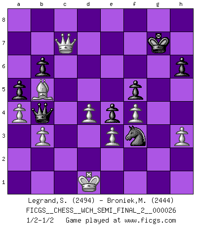 Last move : 1/2-1/2 2024 March 2 18:2:38 [Event "FICGS__CHESS__WCH_SEMI_FINAL_2__000026"] [Site "FICGS"] [Date "2023.07.06"] [Round "7"] [White "Legrand,Stephane"] [Black "Broniek,Mariusz Maciej"] [Result "1/2-1/2"] [WhiteElo "2494"] [BlackElo "2444"] 1.d4 Nf6 2.c4 e6 3.Nf3 d5 4.g3 Bb4+ 5.Bd2 Be7 6.Bg2 O-O 7.O-O c6 8.Qc2 b6 9.Ne5 Bb7 10.cxd5 cxd5 11.Rc1 Ne4 12.a3 Bd6 13.Bb4 f6 14.Bxd6 Qxd6 15.Nf3 Nc6 16.e3 Rac8 17.Qd1 e5 18.Nc3 Nxc3 19.Rxc3 e4 20.Nd2 Ne7 21.Rxc8 Bxc8 22.Rc1 Bd7 23.Nb1 g5 24.Nc3 a5 25.Bf1 Rc8 26.Kg2 Kg7 27.Nb5 Rxc1 28.Qxc1 Bxb5 29.Bxb5 f5 30.f4 gxf4 31.gxf4 Qg6+ 32.Kf2 Kf7 33.Qf1 Qg4 34.Be2 Qh4+ 35.Kg2 Nc8 36.a4 Ke6 37.Qd1 Ne7 38.Qc1 Kd6 39.Qc3 Nc6 40.h3 Qh6 41.Bb5 Na7 42.Be2 Qg6+ 43.Kf2 Qe8 44.b3 Qd7 45.Qe1 Qe7 46.Kg2 Qg7+ 47.Kf1 Qh6 48.Qg3 Nc6 49.Kf2 Ne7 50.Qg5 Qf8 51.Qh5 h6 52.Bf1 Kc7 53.Bb5 Kd6 54.Ke1 Ke6 55.Kd2 Ng8 56.Ba6 Kf6 57.Bb5 Kg7 58.Be8 Qf6 59.Bd7 Ne7 60.Be8 Qe6 61.Kd1 Ng6 62.Bb5 Qf7 63.Qe2 Qb7 64.Qe1 Qe7 65.Qc3 Nh4 66.Qc6 Nf3 67.Qxd5 Qb4 68.Qb7+ Kh8 69.Qc8+ Kg7 70.Qc7+ Kf8 71.Qc8+ Kg7 72.Qc7+ Kf8 73.Qc8+ Kg7 74.Qc7+ 1/2-1/2 Follow this game move after move (download)Of all my Russian books, the defense contains and diffuses the greatest 'warmth' which may seem odd seeing how supremely abstract Chess is supposed to be. (Vladimir Nabokov) Schach sollte überall auf der Welt Schulfach werden. Es fördert die geistige Auseinandersetzung. Es lehrt die Demut in der Niederlage. (Garry Kasparov) Cuando estes solo, cuando te sientas un extraño en el mundo, juega al Ajedrez. Esto levantará tu espiritu y será tu consejero de guerra. (Aristóteles) Plusieurs personnes se sont demandées comment Tal faisait pour gagner... En fait, c'est très simple ! Il met ses pièces au centre de l'échiquier et les sacrifie quelque part ! (David Bronstein) The difference between stupidity and genius is that genius has its limits. (Murphy)
