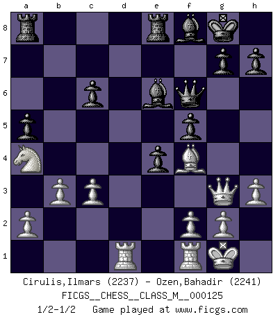 Last move : 1/2-1/2 2023 July 22 13:32:1 [Event "FICGS__CHESS__CLASS_M__000125"] [Site "FICGS"] [Date "2023.07.06"] [Round "1"] [White "Cirulis,Ilmars"] [Black "Ozen,Bahadir"] [Result "1/2-1/2"] [WhiteElo "2237"] [BlackElo "2241"] 1.e4 e5 2.Nf3 Nf6 3.Nc3 Nc6 4.d4 exd4 5.Nxd4 Bb4 6.Nxc6 bxc6 7.Bd3 d5 8.exd5 cxd5 9.O-O O-O 10.h3 Re8 11.Qf3 c6 12.Bf4 a5 13.Na4 Be6 14.b3 Ne4 15.Bxe4 dxe4 16.Qg3 f5 17.c3 Bf8 18.Rad1 Qf6 19.Be5 Qh6 20.Bf4 Qf6 1/2-1/2 Follow this game move after move (download)I am still a victim of Chess. It has all the beauty of art and much more. It cannot be commercialized. Chess is much purer than art in its social position. (Marcel Duchamp) Offensichtlich kennt Kasparow nichts anderes als Schach, und ich könnte 500 weitere Spieler dieser Sorte benennen. (Judith Polgar) Bobby es la celebridad menos entendida y malinterpretada que camina el la faz de esta tierra. (Yasser Seirawan) Si je n'étais pas joueur d'échecs, je serais le meilleur dans quelque chose d'autre. (Anatoli Karpov) Perseverance does not equal worthiness. Next time you want to get my attention, wear something fun. Low-riding jeans are hot. (Gregory House, House M.D.)