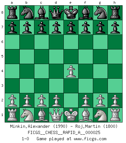 Last move : 1-0 2007 October 2 22:57:56 [Event "FICGS__CHESS__RAPID_A__000025"] [Site "FICGS"] [Date "2007.09.02"] [Round "1"] [White "Minkin,Alexander"] [Black "Roj,Martin"] [Result "1-0"] [WhiteElo "1990"] [BlackElo "1800"] 1.e4 1-0 This chess game has been lost on time (started : 2007.09.02 18:20:15) King's pawn Opening Player White won this chess game. Follow this game move after move (download)Becoming successful at Chess allows you to discover your own personality. That's what I want for the kids I teach. (Saudin Robovic) Die unerbitterlichsten Regeln im Schach sind die Ausnahmen. (Savielly Grigorievitsch Tartakower) Preferería tener un Peón que un dedo. (Reuben Fine) Botvinnik disait en comparant les échecs à la musique: Il existe une science dont le but est l'étude de l'acoustique et des sons. Mais il y a aussi un art qui se sert de l'océan des sons : c'est la musique. De toute évidence, il en est de même pour la pensée. La logique est l'étude des lois de la réflexion et les échecs reflètent, en tant qu'art, le côté logique de la réflexion, sous la forme d'images artistiques... Extrait de Fischer - Spassky, Reykjavik 1972 par Alexander & F. Wyndham (Ed. Solar), p 37. Quotation,n.: The act of repeating erroneously the words of another. The words erroneously repeated. (Ambrose Bierce, The Devil's Dictionary)