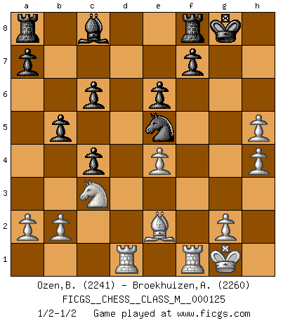 Last move : 1/2-1/2 2023 August 12 8:20:7 [Event "FICGS__CHESS__CLASS_M__000125"] [Site "FICGS"] [Date "2023.07.06"] [Round "1"] [White "Ozen,Bahadir"] [Black "Broekhuizen,A. T. S."] [Result "1/2-1/2"] [WhiteElo "2241"] [BlackElo "2260"] 1.d4 Nf6 2.c4 e6 3.Nf3 d5 4.Nc3 c6 5.Bg5 h6 6.Bh4 dxc4 7.e4 g5 8.Bg3 b5 9.Ne5 h5 10.h4 g4 11.Be2 Bg7 12.O-O O-O 13.f3 Nfd7 14.fxg4 Nxe5 15.Bxe5 Bxe5 16.dxe5 Qxd1 17.Raxd1 Nd7 18.gxh5 Nxe5 1/2-1/2 Follow this game move after move (download)Adequate compensation for a sacrifice is having a sound combination leading to a winning position; adequate compensation for a blunder is having your opponent snatch defeat from the jaws of victory. (Bruce A. Moon) Schach ist gnadenlos. Du mußt bereit sein zu töten. (Nigel Short) El Ajedrez es en su esencia, un juego. En su forma, un arte. Y en su ejecución, una ciencia. (Baron Tassilo) Les pièces de l'échiquier étaient impitoyables. Elles le retenaient, elles l'absorbaient. Il y avait de l'horreur en cela, mais aussi une harmonie unique. Car, qu'y a-t-il dans le monde, à part les échecs ? (V. Nabokov) Do you know these so called Volunteers don't even get paid! (Simpsons)