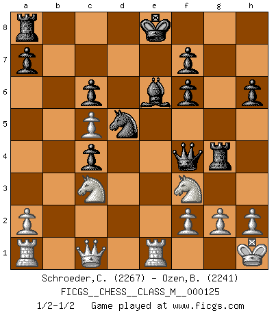Last move : 1/2-1/2 2023 September 26 13:10:29 [Event "FICGS__CHESS__CLASS_M__000125"] [Site "FICGS"] [Date "2023.07.06"] [Round "1"] [White "Schroeder,Christoph"] [Black "Ozen,Bahadir"] [Result "1/2-1/2"] [WhiteElo "2267"] [BlackElo "2241"] 1.e4 e5 2.Nf3 Nc6 3.Bb5 Nf6 4.d3 Bc5 5.Bg5 h6 6.Bh4 Ne7 7.Bxf6 gxf6 8.d4 exd4 9.O-O c6 10.Bc4 Rg8 11.Kh1 d6 12.c3 dxc3 13.b4 d5 14.exd5 Rg4 15.Qb3 b5 16.bxc5 bxc4 17.Qxc3 Nxd5 18.Qc1 Be6 19.Nc3 Qc7 20.Re1 Qf4 1/2-1/2 Follow this game move after move (download)There is only one thing Fischer does in Chess without pleasure: to lose ! (Boris Spassky) Jeder weiß, dass Gasprom Putins persönliches Machtinstrument ist. Die Firma wird vom Kreml aus geleitet und wird schon deshalb nie transparent sein. (Garry Kasparov) El Ajedrez, como cualquier otra actividad creativa, puede existir solo a través de méritos combinados de aquellos que tienen talento creativo y de aquellos que tienen la habilidad de organizar un trabajo creativo. (Mikhail Botvinnik) Votre seul travail dans les ouvertures est d'obtenir un milieu de partie jouable. (Lajos Portish) A cynic is a man who knows the price of everything but the value of nothing. (Oscar Wilde)