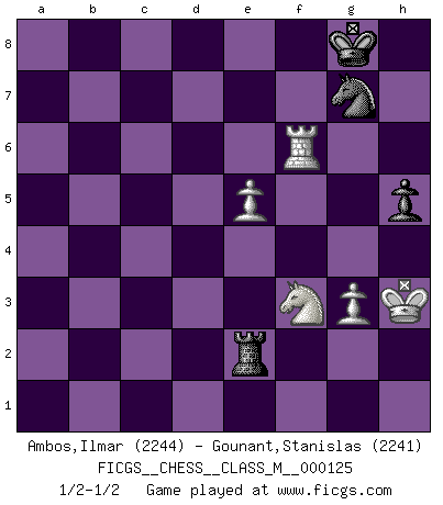 Last move : 1/2-1/2 2023 November 6 20:7:3 [Event "FICGS__CHESS__CLASS_M__000125"] [Site "FICGS"] [Date "2023.07.06"] [Round "1"] [White "Ambos,Ilmar"] [Black "Gounant,Stanislas"] [Result "1/2-1/2"] [WhiteElo "2244"] [BlackElo "2241"] 1.d4 b6 2.c4 e6 3.e4 Bb4+ 4.Bd2 Bxd2+ 5.Qxd2 d5 6.Qe3 Ne7 7.Nc3 O-O 8.Nf3 Bb7 9.cxd5 exd5 10.e5 c5 11.Bd3 Nbc6 12.O-O Bc8 13.Rad1 c4 14.Bb1 Bf5 15.b3 cxb3 16.axb3 Qd7 17.Bxf5 Nxf5 18.Qg5 a5 19.Nxd5 Qxd5 20.Qxf5 h6 21.Qg4 b5 22.Rc1 Ne7 23.Rc7 Rfe8 24.Rc5 Qxb3 25.d5 Qa3 26.Rxb5 Qd3 27.Qa4 Nxd5 28.Rxa5 Nc7 29.Rxa8 Rxa8 30.Qc6 Qd8 31.h4 Ne6 32.Rc1 Ra7 33.Qe4 Qa8 34.Qxa8+ Rxa8 35.g3 g5 36.h5 Ng7 37.Rc6 Kh7 38.Rf6 g4 39.Nd2 Ra1+ 40.Kg2 Nxh5 41.Rxf7+ Ng7 42.Rf6 h5 43.Ne4 Re1 44.Ng5+ Kg8 45.f4 gxf3+ 46.Nxf3 Re2+ 47.Kh3 1/2-1/2 Follow this game move after move (download)Chess is a cold bath for the mind. (Sir John Simon) Die Idee von Capablanca, Schach als Fach in den Schulen zu lehren, ist großartig. (Fidel Castro) Yo tuve un dolor de muelas en la primer partida. En el segundo juego, tuve un dolor de cabeza. En el tercero, tuve un ataque de reumatísmo. En la cuarta partida, no me sentía muy bien. ¿Y en el quinto juego? Bueno, ¿que acaso uno tiene que ganar todos los juegos?. (Siegbert Tarrasch) D'abord les bases : Jouez et étudiez, puis étudiez et jouez, ensuite jouez et étudiez, puis étudiez et jouez. Deuxièmement : Donnez toujours le meilleur de vous-même ! (Ken Smith) Don't be irreplaceable, if you can't be replaced, you can't be promoted. (Dan Rotaru)