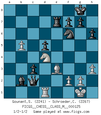 Last move : 1/2-1/2 2024 January 4 14:29:40 [Event "FICGS__CHESS__CLASS_M__000125"] [Site "FICGS"] [Date "2023.07.06"] [Round "1"] [White "Gounant,Stanislas"] [Black "Schroeder,Christoph"] [Result "1/2-1/2"] [WhiteElo "2241"] [BlackElo "2267"] 1.d4 Nf6 2.Nf3 d5 3.e3 c5 4.dxc5 e6 5.b4 a5 6.c3 axb4 7.cxb4 b6 8.Bb5+ Bd7 9.Bxd7+ Nbxd7 10.a4 bxc5 11.b5 Bd6 12.Bb2 O-O 13.Nbd2 e5 14.e4 c4 15.O-O Rc8 16.Rc1 Bb4 17.Nxe5 Nxe5 18.Bxe5 c3 19.Nf3 Nxe4 20.Bd4 Ba3 21.Rc2 Qa5 22.Ra2 Bb2 23.Qb3 Rc4 24.Be3 Re8 25.Qd1 Nf6 26.Nd4 h6 27.h3 Re4 28.Nc2 Rxa4 29.Rxa4 Qxa4 30.Qd3 Qb3 31.Rd1 Re7 32.Nd4 Qa4 33.Qc2 Qxc2 1/2-1/2 Follow this game move after move (download)The sign of a great Master is his ability to win a won game quickly and painlessly. (Irving Chernev) Ein Schachgenie ist jemand der verdammt gut Schach spielt. (Jonathan Levitt) Todo lo que importa ante el tablero de Ajedrez son buenas jugadas. (Bobby Fischer) Pour moi, les échecs ne sont pas un jeu mais un art. (Alexandre Alekhine) The only thing that matters is the evidence. (Horatio Caine, C.S.I. Miami)