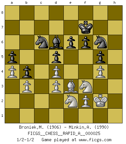 Last move : 1/2-1/2 2007 December 12 8:4:57 [Event "FICGS__CHESS__RAPID_A__000025"] [Site "FICGS"] [Date "2007.09.02"] [Round "1"] [White "Broniek,Mariusz Maciej"] [Black "Minkin,Alexander"] [Result "1/2-1/2"] [WhiteElo "1906"] [BlackElo "1990"] 1.d4 Nf6 2.Bg5 c5 3.Nc3 d5 4.h3 Nc6 5.e3 cxd4 6.exd4 a6 7.Be3 Bf5 8.Bd3 Bxd3 9.cxd3 Qb6 10.Nf3 e6 11.O-O Bd6 12.Na4 Qa7 13.Qd2 O-O 14.Rfc1 Rfc8 15.Rc2 Ne8 16.Rac1 Rc7 17.a3 Rac8 18.g3 b6 19.Kg2 Ne7 20.Rxc7 Rxc7 21.Bf4 Rxc1 22.Qxc1 f6 23.Bd2 Qc7 24.Qe1 Kf7 25.Qd1 b5 26.Nc3 Nc6 27.Ne2 b4 28.a4 a5 29.b3 g5 30.g4 Ng7 31.Ng3 Ne7 32.h4 h6 33.Kh3 Qd7 34.Kg2 Ng6 35.hxg5 hxg5 36.Be3 Qc7 37.Ne2 Ne8 38.Kf1 Kf8 39.Kg2 Qc8 40.Qc1 Qxc1 41.Bxc1 Nc7 42.Ng3 Na6 43.Ne1 Nb8 44.Nf3 Kf7 45.Ne2 Nc6 46.Ne1 Ke7 47.Nf3 Bc7 48.Bd2 Kf7 49.Be3 Bd6 1/2-1/2 Trompowsky attack (Ruth, Opovcensky Opening) Kingside Castling by player White (move 11) Kingside Castling by player Black (move 13) This chess game ended in a draw. Follow this game move after move (download)No Chess Grandmaster is normal; they only differ in the extent of their madness. (Viktor Korchnoi) Mein erstes Ziel war nicht, die Partie zu gewinnen, sondern eine Figur zu opfern. -- der junge (Wilhelm Steinitz) Bobby Fischer es el jugador de Ajedrez mas grande que jamás haya existido. (Ken Smith) Je fais ceci parce que dans cinquante coups j'obtiendrai cela; je m'appelle Mikhail Moisevitch Botvinnik. (Botvinnik) Wawaweewa ! (Borat: Cultural learnings of America for make benefit glorious nation of Kazakhstan)