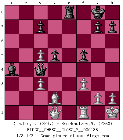 Last move : 1/2-1/2 2023 July 27 11:57:27 [Event "FICGS__CHESS__CLASS_M__000125"] [Site "FICGS"] [Date "2023.07.06"] [Round "1"] [White "Cirulis,Ilmars"] [Black "Broekhuizen,A. T. S."] [Result "1/2-1/2"] [WhiteElo "2237"] [BlackElo "2260"] 1.e4 e5 2.Nf3 Nc6 3.Bb5 Nf6 4.d3 Bc5 5.Nbd2 O-O 6.Nb3 Bb6 7.Bxc6 bxc6 8.a4 a5 9.Nxe5 d5 10.O-O Re8 11.d4 Nxe4 12.Be3 Qh4 13.Nxc6 f5 14.f3 Qf6 15.Nbxa5 Nd6 16.Bd2 Nb7 17.b4 Bd7 18.Nxb7 Bxc6 19.Nc5 Qxd4+ 20.Kh1 Bxc5 21.c3 Qc4 22.bxc5 Rxa4 23.Rxa4 Bxa4 1/2-1/2 Follow this game move after move (download)Why must I lose to this idiot ? (Aron Nimzovich) Man wirke der falschen Auffassung entgegen, als ob jeder Zug Unmittelbares zu leisten habe; auch Werte- und Ruhezüge haben ihre Existenzberechtigung. (Aaron Nimzowitsch) El jugador táctico debe saber que hacer cuando algo se debe de hacer. El estratégico debe saber que hacer cuando nada se debe de hacer. (Savielly Tartakover) Je ne crois pas en la psychologie, je crois aux bons coups. (Robert Fischer) He who is a good ruler must first have been ruled. (Aristotle)