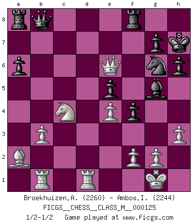 Last move : 1/2-1/2 2023 September 25 18:30:55 [Event "FICGS__CHESS__CLASS_M__000125"] [Site "FICGS"] [Date "2023.07.06"] [Round "1"] [White "Broekhuizen,A. T. S."] [Black "Ambos,Ilmar"] [Result "1/2-1/2"] [WhiteElo "2260"] [BlackElo "2244"] 1.e4 e5 2.Nf3 Nc6 3.Bb5 a6 4.Ba4 Nf6 5.O-O Be7 6.Re1 b5 7.Bb3 d6 8.c3 O-O 9.h3 Re8 10.d4 Bb7 11.a3 h6 12.Ba2 Qd7 13.d5 Na7 14.c4 c6 15.b3 Bd8 16.Nc3 Nc8 17.Qd3 Ne7 18.dxc6 Nxc6 19.Be3 b4 20.Nd5 Nxd5 21.cxd5 Ne7 22.Nd2 f5 23.axb4 f4 24.Bc5 Ng6 25.Nc4 dxc5 26.bxc5 Rf8 27.Red1 Kh7 28.c6 Bxc6 29.dxc6 Qxc6 30.Qd5 Qc8 31.Rac1 Qb8 32.Qe6 Bg5 33.Rb1 1/2-1/2 Follow this game move after move (download)When I asked Fischer why he had not played a certain move in our game, he replied: 'Well, you laughed when I wrote it down !' (Mikhail Tal) Ich glaube nicht an Psychologie, ich glaube an gute Züge. (Robert James Fischer) Bobby es la celebridad menos entendida y malinterpretada que camina el la faz de esta tierra. (Yasser Seirawan) J'ai vu le vaincu d'Echecs jouer des années durant dans l'espoir de la fête de la victoire. Car tu es plus riche de ce qu'elle existe si même elle n'est point pour toi. Ainsi de la perle du fond des mers. (Antoine de Saint-Exupéry) Man is still the most extraordinary computer of all. (John F. Kennedy)