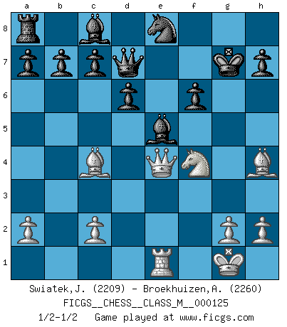 Last move : 1/2-1/2 2023 September 18 23:22:7 [Event "FICGS__CHESS__CLASS_M__000125"] [Site "FICGS"] [Date "2023.07.06"] [Round "1"] [White "Swiatek,Janusz"] [Black "Broekhuizen,A. T. S."] [Result "1/2-1/2"] [WhiteElo "2209"] [BlackElo "2260"] 1.e4 e5 2.Nf3 Nc6 3.Bb5 Nf6 4.O-O Nxe4 5.Re1 Nd6 6.Nxe5 Be7 7.Bf1 Nxe5 8.Rxe5 O-O 9.d4 Bf6 10.Re1 Re8 11.Bf4 Rxe1 12.Qxe1 Ne8 13.Nc3 Bxd4 14.Nd5 d6 15.Bg5 f6 16.Bh4 g5 17.Qe4 Bxb2 18.Re1 Be5 19.Bd3 Qd7 20.f4 gxf4 21.Bc4 Kg7 22.Nxf4 1/2-1/2 Follow this game move after move (download)When you are lonely, when you feel yourself an alien in the world, play Chess. This will raise your spirits and be your counselor in war. (Aristotle) Schach ist wie eine schöne Frau, zu der wir ständig zurückkehren, gleichviel, wie oft sie uns zurückweist. (Anonymous) Botvinnik trató de alejar el misterio referente al Ajedrez, siempre relacionandolo a situaciones de la vida diaria. Solía llamar al Ajedrez un problema inexacto típico, similar a aquellos en que la gente tiene siempre que resolver a cada día. (Garry Kasparov) Je ne suis pas le dernier à jouer lâchement des coups douteux pendant le zeïtnot de l'adversaire pour l'achever: en effet les coups qui font le plus peur sont ceux que l'on ne comprend pas. Je me fais souvent peur quand je joue. (Un professeur anonyme) Work expands to fill the time available. (C. Northcote Parkinson, in Parkinson's Laws)