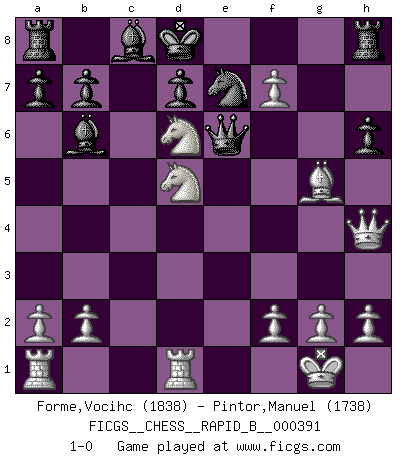Last move : 1-0 2023 August 7 3:29:0 [Event "FICGS__CHESS__RAPID_B__000391"] [Site "FICGS"] [Date "2023.07.10"] [Round "1"] [White "Forme,Vocihc"] [Black "Pintor,Manuel"] [Result "1-0"] [WhiteElo "1838"] [BlackElo "1738"] 1.e4 e5 2.Nf3 Nc6 3.Bb5 Qf6 4.O-O Bc5 5.c3 h6 6.d4 exd4 7.e5 Qg6 8.cxd4 Bb6 9.Nc3 Nge7 10.d5 Na5 11.Nh4 Qh7 12.Bd3 g6 13.d6 Nf5 14.Bxf5 gxf5 15.Nd5 Kd8 16.Qh5 cxd6 17.Nxf5 Qg6 18.Qh4+ f6 19.exf6 Qf7 20.Rd1 Nc6 21.Nxd6 Qe6 22.f7 Ne7 23.Bg5 1-0 Follow this game move after move (download)The beauty of a move lies not in its' appearance but in the thought behind it. (Siegbert Tarrasch) Rauchen ist dem Schachspieler bei seiner Arbeit, also im Wettkampf, untersagt. (Viktor Kortschnoi) No todos los artistas son jugadores de Ajedrez, pero todos los jugadores de Ajedrez son artistas. (Marcel Duchamp) Dieu déplace le joueur, et celui-ci la pièce. Quel Dieu derrière Dieu commence donc la trame ? Arturo Perez-Reverte (prix de littérature policière 1993). I don't know, I don't care, and it doesn't make any difference. (Albert Einstein)