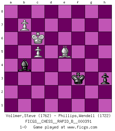 Last move : 1-0 2023 July 26 15:53:25 [Event "FICGS__CHESS__RAPID_B__000391"] [Site "FICGS"] [Date "2023.07.10"] [Round "1"] [White "Vollmer,Steve"] [Black "Phillips,Wendell"] [Result "1-0"] [WhiteElo "1762"] [BlackElo "1722"] 1.d4 c6 2.c4 d6 3.Nf3 Nd7 4.e4 e5 5.dxe5 dxe5 6.Nc3 Be7 7.Qc2 h6 8.Be2 Qc7 9.O-O Nf8 10.b3 Ng6 11.Bb2 Nf6 12.Rfe1 O-O 13.h3 Re8 14.Rad1 Be6 15.Bf1 Rad8 16.a3 Bd6 17.b4 Qb8 18.c5 Bc7 19.Nd2 Qc8 20.Nc4 Bxc4 21.Bxc4 Rxd1 22.Rxd1 Rd8 23.Rxd8+ Qxd8 24.Ne2 Qd7 25.Ng3 Nh4 26.a4 Kf8 27.b5 Qe7 28.Bd3 Qe6 29.Bc3 Qe7 30.Bd2 Qd8 31.Be3 Qd7 32.f3 Qd8 33.Kf2 Qd7 34.Bf1 Qd8 35.Ne2 Ng6 36.g3 Qd7 37.Nc1 Qd8 38.Nd3 Qe8 39.Nb2 Qe6 40.Nc4 Ne8 41.Kg2 Kg8 42.Bd2 Qe7 43.Ne3 Qd7 44.Bc4 Nf6 45.Nf5 Ne7 46.Nxe7+ Qxe7 47.a5 Kf8 48.b6 axb6 49.axb6 Bd8 50.Qd3 Qd7 51.Qe3 Kg8 52.Bc3 Qe7 53.Bd3 Nd7 54.Bb4 f6 55.Ba3 Qf8 56.Bc4+ Kh8 57.Be6 Qe7 58.Bxd7 Qxd7 59.Bb4 Be7 60.g4 Qe6 61.Be1 Qc4 62.Bf2 Kg8 63.h4 Kf7 64.Qa3 Qe6 65.Qa8 Qd7 66.Qb8 Bd8 67.h5 Ke7 68.Kg3 Kf7 69.Be3 Ke7 70.f4 exf4+ 71.Kxf4 Kf7 72.e5 fxe5+ 73.Qxe5 Bg5+ 74.Kg3 Bf6 75.Qe4 Qe7 76.Qxe7+ Kxe7 77.Kf3 Ke6 78.Ke4 Bc3 79.Bf4 Bb4 80.Be5 Kf7 81.Bd4 g6 82.hxg6+ Kxg6 83.Ke5 Kg5 84.Kd6 Kxg4 85.Kc7 h5 86.Kxb7 h4 87.Kxc6 h3 88.Be5 Kf3 89.b7 1-0 Follow this game move after move (download)In Fischer's hands, a slight theoretical advantage is as good a being a Queen ahead. (Isaac Kashdan) Es macht mich traurig, wenn ich sehe, dass Golfprofis mehr verdienen als Schachsportler. Obwohl ich davon überzeugt bin, dass wir Schachspieler viel härter trainieren müssen als die Golfer. (Alexandra Kosteniuk) Un mal día en el Ajedrez, es mejor que cualquier buen día en el trabajo. (Anonymous) D'abord les bases : Jouez et étudiez, puis étudiez et jouez, ensuite jouez et étudiez, puis étudiez et jouez. Deuxièmement : Donnez toujours le meilleur de vous-même ! (Ken Smith) Hello Thibault, if I have had a plan (and I had one, I hope), I have forgotten it during the last week... - Hello Heinz-Georg. What do you mean a plan ? (Anonymous players, during a Big Chess game)