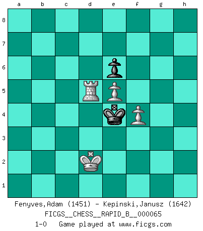 Last move : 1-0 2008 January 3 15:21:33 [Event "FICGS__CHESS__RAPID_B__000065"] [Site "FICGS"] [Date "2007.09.04"] [Round "1"] [White "Fenyves,Adam"] [Black "Kepinski,Janusz"] [Result "1-0"] [WhiteElo "1451"] [BlackElo "1642"] 1.e4 e6 2.d4 d5 3.Nc3 Nf6 4.e5 Ne4 5.Nxe4 dxe4 6.Be3 c5 7.dxc5 Nd7 8.Qg4 Nxc5 9.Bb5+ Nd7 10.Ne2 Qa5+ 11.Nc3 Bb4 12.Qxg7 Bxc3+ 13.bxc3 Rf8 14.Rb1 Qxc3+ 15.Bd2 Qxc2 16.Ke2 e3 17.Kxe3 Qg6 18.Qxg6 fxg6 19.Rhd1 a6 20.Bxd7+ Bxd7 21.Rxb7 Rf5 22.Bc3 Bc6 23.Rxh7 Bxg2 24.Rg1 Rf3+ 25.Ke2 Rh3 26.Rxh3 Bxh3 27.Rxg6 Kf7 28.Rf6+ Ke7 29.Bb4+ Kd7 30.Rf4 Rg8 31.Rh4 Bf5 32.Kf3 Kc6 33.Rd4 Bh3 34.a4 Rg5 35.Rd6+ Kb7 36.Bc3 Bg2+ 37.Ke3 Bd5 38.Bd4 a5 39.Rb6+ Kc7 40.Ra6 Rh5 41.Rxa5 Rh3+ 42.Kd2 Rh4 43.Be3 Rxh2 44.Ra7+ Kc6 45.Ra6+ Kb7 46.Rb6+ Kc7 47.a5 Rh1 48.a6 Ra1 49.Rd6 Ra2+ 50.Kc1 Kc8 51.a7 Kb7 52.Kb1 Ra6 53.Rd8 Bf3 54.Rb8+ Kc7 55.Bc5 Kc6 56.a8Q+ Rxa8 57.Rxa8 Kxc5 58.Rd8 Bd5 59.f4 Kd4 60.Kc1 Ke4 61.Kd2 Bc6 62.Rd6 Bd5 63.Rxd5 1-0 French : Steinitz variation 10 pieces endgame at move 43 : White KRBPPP , Black KRBP WHITE : King + 1 Rook 1 Bishop 3 Pawns BLACK : King + 1 Rook 1 Bishop 1 Pawn Promotion Queen by player White (move 56) 9 pieces endgame at move 56 : White KRBPP , Black KRBP WHITE : King + 1 Rook 1 Bishop 2 Pawns BLACK : King + 1 Rook 1 Bishop 1 Pawn 8 pieces endgame at move 57 : White KRBPP , Black KBP WHITE : King + 1 Rook 1 Bishop 2 Pawns BLACK : King + 1 Bishop 1 Pawn 7 pieces endgame at move 57 : White KRPP , Black KBP WHITE : King + 1 Rook 2 Pawns BLACK : King + 1 Bishop 1 Pawn 6 pieces endgame at move 63 : White KRPP , Black KP WHITE : King + 1 Rook 2 Pawns BLACK : King + 1 Pawn Player White won this chess game. Follow this game move after move (download)If I win a tournament, I win it by myself. I do the playing. Nobody helps me. (Bobby Fischer) Wie ich sie so einen nach dem anderen nieder mähte wurde meine Überlegenheit offensichtlich. (José Raúl Capablanca) Cuando le juegas a Fischer, no es una cuestion de si vas a ganar o perder. Es una cuestion de si vas a sobrevivir. (Boris Spassky) Je crois qu'il existe des manières très spécifiques de jouer efficacement contre une machine. Evidemment, nous n'avons aucune chance en technique pure, parce que l'ordinateur calcule de manière parfaite. Mais lorsque nous faisons appel à notre cerveau, en utilisant l'intuition et la compréhension, alors nous restons beaucoup plus forts. (Anatoli Karpov) CHESS, n. f. [echecs, Fr.] A nice and abstruse game, in which two sets of puppets are moved in opposition to each other. (Dr Samuel Johnson, A Dictionary Of The English Language, 1755)