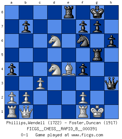Last move : 0-1 2023 August 15 1:1:45 [Event "FICGS__CHESS__RAPID_B__000391"] [Site "FICGS"] [Date "2023.07.10"] [Round "1"] [White "Phillips,Wendell"] [Black "Foster,Duncan"] [Result "0-1"] [WhiteElo "1722"] [BlackElo "1917"] 1.e4 c6 2.d3 d5 3.Nd2 e5 4.c3 Nd7 5.Be2 Ngf6 6.h3 Bd6 7.Qc2 O-O 8.Nf1 h6 9.Ng3 a5 10.Nf3 a4 11.Bd2 Re8 12.O-O Nf8 13.Bd1 Ng6 14.Be2 c5 15.Qb1 Nf4 16.Bd1 c4 17.Bc2 Bxh3 18.gxh3 Qd7 19.Bxf4 exf4 20.Nf5 cxd3 21.Bxd3 dxe4 22.N3d4 Ra5 23.Nxd6 Qxh3 24.Bxe4 Rg5+ 0-1 Follow this game move after move (download)Your body has to be in top condition. Your Chess deteriorates as your body does. You can't separate body from mind. (Bobby Fischer) Konzentriere dich auf materielle Gewinne. Nimm, was dir dein Gegner gibt, ausser es gibt einen guten Grund der dagegenspricht. (Robert James Fischer) Un mal plan es mejor que no tener ningún plan. (Frank Marshall) Toutes choses étant égales, c'est la conviction qui gagne. Alliée à une volonté de vaincre, elle sert de détonateur, suscite des idées, disperse les doutes et aide à penser clairement. (Robert Fischer) May the force be with you. (Han Solo in Star Wars ep.4)
