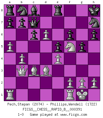 Last move : 1-0 2023 August 31 13:58:31 [Event "FICGS__CHESS__RAPID_B__000391"] [Site "FICGS"] [Date "2023.07.10"] [Round "1"] [White "Pech,Stepan"] [Black "Phillips,Wendell"] [Result "1-0"] [WhiteElo "2074"] [BlackElo "1722"] 1.b4 d6 2.e3 c6 3.d4 Qc7 4.Bd3 e5 5.Bb2 Nd7 6.Nf3 Ngf6 7.Nbd2 h6 8.c4 Be7 9.a4 O-O 10.O-O Re8 11.a5 Bf8 12.Qc2 Qd8 13.dxe5 dxe5 14.c5 Qe7 15.e4 Qd8 16.Nc4 Qc7 17.Bc3 Nh7 18.Qb2 f6 19.Qb3 Kh8 20.Nh4 g5 21.Nf5 Nb8 22.Ncd6 Bxd6 23.cxd6 1-0 Follow this game move after move (download)I like the moment when I break a man's ego. (Bobby Fischer) Fallen sollten polizeilich verboten werden. (Savielly Grigorievitsch Tartakower) Las Aperturas te enseñan aperturas. ¡Los Finales te enseñan Ajedrez!. (Stephan Gerzadowicz) Le jeu d'échecs fait naître et fortifie en nous plusieurs qualités précieuses dans le cours de l'existence, telles que la prévoyance, la circonspection, la prudence, et la persévérance. (Benjamin Franklin - 1783, la morale des échecs) If everyone is thinking alike, then somebody isn't thinking. (US General George S. Patton)