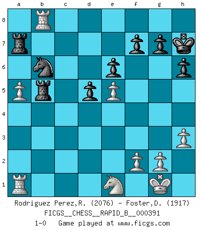 Last move : 1-0 2023 November 14 22:59:27 [Event "FICGS__CHESS__RAPID_B__000391"] [Site "FICGS"] [Date "2023.07.10"] [Round "1"] [White "Rodriguez Perez,Rene"] [Black "Foster,Duncan"] [Result "1-0"] [WhiteElo "2076"] [BlackElo "1917"] 1.e4 c6 2.d4 d5 3.e5 Bf5 4.Nf3 e6 5.Be2 c5 6.c3 Nc6 7.O-O Bg4 8.Nbd2 cxd4 9.cxd4 Bh5 10.a3 a5 11.Qb3 Qc7 12.h3 Nge7 13.Qc3 a4 14.Re1 h6 15.b4 axb3 16.Bb2 Nc8 17.Bd3 Be7 18.Qxb3 O-O 19.Reb1 Na5 20.Qc3 Qc6 21.Qxc6 bxc6 22.Bc3 Bxf3 23.Nxf3 Bd8 24.Bb4 Re8 25.Ne1 Nb6 26.Bxa5 Rxa5 27.Rc1 Ra4 28.Rxc6 Rxd4 29.Bb5 Re7 30.a4 Ra7 31.a5 Rb4 32.Rd6 Rxb5 33.Rxd8+ Kh7 34.Rb8 1-0 Follow this game move after move (download)By the beauty of his games, the clarity of his play, and the brilliance of his ideas, Fischer made himself an artist of the same stature as Brahms, Rembrandt, and Shakespeare. (David Levy) Die Idee von Capablanca, Schach als Fach in den Schulen zu lehren, ist großartig. (Fidel Castro) Haz el enroque temprano y seguido. (Rob Sillars) A ce moment-là, je menaçais de comprendre la position ! (Clément L'Heureux) It's not the size of the dog in the fight, it's the size of the fight in the dog. (Mark Twain)