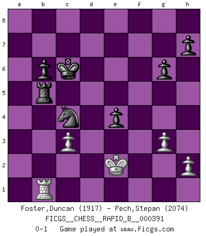Last move : 0-1 2023 November 20 14:48:4 [Event "FICGS__CHESS__RAPID_B__000391"] [Site "FICGS"] [Date "2023.07.10"] [Round "1"] [White "Foster,Duncan"] [Black "Pech,Stepan"] [Result "0-1"] [WhiteElo "1917"] [BlackElo "2074"] 1.e4 c5 2.a3 g6 3.b4 Bg7 4.Nc3 d6 5.g3 Nc6 6.Rb1 Nf6 7.Bg2 cxb4 8.axb4 Bg4 9.f3 Bd7 10.b5 Nd4 11.Nge2 Nxe2 12.Qxe2 a6 13.O-O O-O 14.d4 Rc8 15.Qe3 axb5 16.e5 Ne8 17.f4 Bc6 18.Bh3 Bd7 19.Bxd7 Qxd7 20.Qd3 dxe5 21.fxe5 f6 22.Nxb5 fxe5 23.Qb3+ e6 24.Rxf8+ Kxf8 25.Be3 exd4 26.Nxd4 Bxd4 27.Qb4+ Qd6 28.Qxd4 Qxd4 29.Bxd4 Nd6 30.Be5 Nc4 31.Bf4 b6 32.Bh6+ Ke7 33.Bg5+ Kd6 34.Kf2 e5 35.Kf3 Kd5 36.Rb5+ Rc5 37.Rb3 e4+ 38.Ke2 Kc6 39.c3 Rxg5 40.Rb1 Rb5 0-1 Follow this game move after move (download)The defensive power of a pinned piece is only imaginary. (Aaron Nimzovich) Frage: Gibt es etwas was Sie mehr lieben als Autobahnen ohne Tempobegrenzungen? - Antwort: Deutsche Frauen ohne Tempobegrenzungen. (Loek van Wely) Las leyes del Ajedrez no permiten una libre elección: tienes que mover quieras o no. (Emanuel Lasker) Plusieurs personnes se sont demandées comment Tal faisait pour gagner... En fait, c'est très simple ! Il met ses pièces au centre de l'échiquier et les sacrifie quelque part ! (David Bronstein) Optimism is a variety of information deficit. Sometimes especially true for correspondence chess games. (Michael Aigner)