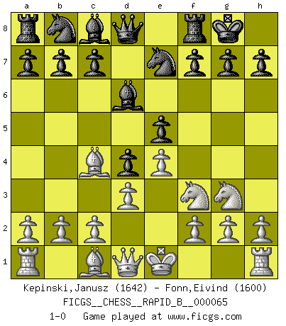 Last move : 1-0 2007 November 1 17:43:34 [Event "FICGS__CHESS__RAPID_B__000065"] [Site "FICGS"] [Date "2007.09.04"] [Round "1"] [White "Kepinski,Janusz"] [Black "Fonn,Eivind"] [Result "1-0"] [WhiteElo "1642"] [BlackElo "1600"] 1.Nc3 d5 2.e4 d4 3.Nce2 e5 4.Nf3 Bd6 5.Ng3 Ne7 6.Bc4 O-O 7.d3 1-0 This chess game has been lost on time (started : 2007.09.04 5:4:18) Dunst (Sleipner, Heinrichsen) Opening Kingside Castling by player Black (move 6) Player White won this chess game. Follow this game move after move (download)Combinations have always been the most intriguing aspect of Chess. The masters look for them, the public applauds them, the critics praise them. It is because combinations are possible that Chess is more than a lifeless mathematical exercise. They are the poetry of the game; they are to Chess what melody is to music. They represent the triumph of mind over matter. (Reuben Fine) Du musst nicht gut spielen, es reicht, wenn du besser spielst als dein Gegner. (Anonymous) Entre mas años cumplo, mas valoro los Peones. (Keres) Les Echecs ne sont pas pour les âmes timides. Ils requièrent un homme entier, qui ne s'arrête pas aveuglément à ce qui a été déjà établi, mais qui tente individuellement de sonder les profondeurs du jeu. (W. Steinitz) Chess is as much a mystery as women. (Purdy)