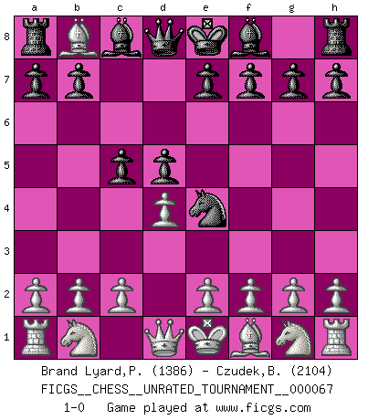 Last move : 1-0 2023 August 23 12:18:37 [Event "FICGS__CHESS__UNRATED_TOURNAMENT__000067"] [Site "FICGS"] [Date "2023.07.10"] [Round "1"] [White "Brand Lyard,Paul"] [Black "Czudek,Bohuslav"] [Result "1-0"] [WhiteElo "1386"] [BlackElo "2104"] 1.d4 d5 2.Bf4 Nf6 3.Bg5 Ne4 4.Bf4 c5 5.Bxb8 1-0 This chess game has been lost on time (started : 2023.07.10 21:49:28) Follow this game move after move (download)Suddenly it was obvious to me in my analysis I had missed what Fischer had found with the greatest of ease at the board. (Mikhail Botvinnik) Kombinieren und Schwarzhandel gehören verboten. (Savielly Grigorievitsch Tartakower) EL Ajedrez es como la vida. (Boris Spassky) Dieu déplace le joueur, et celui-ci la pièce. Quel Dieu derrière Dieu commence donc la trame ? Arturo Perez-Reverte (prix de littérature policière 1993). All battles are fought by scared men who'd rather be someplace else. (John Wayne in the movie In harm's way)