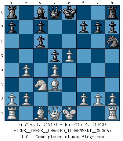 Last move : 1-0 2023 August 31 6:30:8 [Event "FICGS__CHESS__UNRATED_TOURNAMENT__000067"] [Site "FICGS"] [Date "2023.07.10"] [Round "1"] [White "Foster,Duncan"] [Black "Goletto,Piero Giuseppe"] [Result "1-0"] [WhiteElo "1917"] [BlackElo "1340"] 1.e4 e5 2.Nf3 Nc6 3.d4 d5 4.Nxe5 Bd6 5.Nxc6 bxc6 6.e5 Bb4+ 7.c3 Bf5 8.cxb4 Nh6 9.Nc3 Bc8 10.Bd3 1-0 This chess game has been lost on time (started : 2023.07.10 21:49:28) Follow this game move after move (download)The laws of Chess do not permit a free choice: you have to move whether you like it or not. (Emanuel Lasker) Die Partien sind immer verschieden, die Interviews immer die gleichen. (Garry Kasparov) El Ajedrez no es una pizca de inferior al violín, y tenemos un gran número de violinistas profesionales. (Mikhail Botvinnik) Les sacrifices démontrent seulement que quelqu'un a gaffé. (Savielly Tartacover) There's no money in correspondence chess. (John Knudsen)