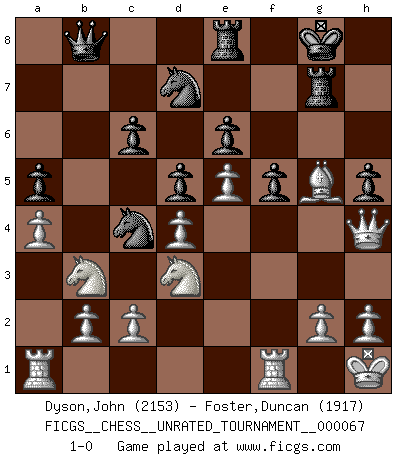 Last move : 1-0 2024 February 23 12:9:1 [Event "FICGS__CHESS__UNRATED_TOURNAMENT__000067"] [Site "FICGS"] [Date "2023.07.10"] [Round "1"] [White "Dyson,John"] [Black "Foster,Duncan"] [Result "1-0"] [WhiteElo "2153"] [BlackElo "1917"] 1.e4 c6 2.d4 d5 3.e5 Bf5 4.Be2 e6 5.Nf3 Nd7 6.O-O Ne7 7.Nbd2 h6 8.Nb3 Nc8 9.Be3 Ncb6 10.a4 a5 11.Ne1 Nc4 12.Bc1 Be7 13.Bd3 Bxd3 14.Nxd3 O-O 15.Qg4 f5 16.Qe2 Rf7 17.Nbc5 Nf8 18.Nxb7 Qb6 19.Nbc5 Qa7 20.f4 Rb8 21.Kh1 Kh7 22.Rf3 Nb6 23.Nb3 Nc4 24.Rh3 g6 25.Qe1 Re8 26.Qf2 h5 27.Qg1 Kg8 28.Nbc5 Qa8 29.Rf3 Nb6 30.Qe1 Bd8 31.Be3 Rg7 32.Rf1 Nfd7 33.Nb3 Nc4 34.Bf2 g5 35.fxg5 Bxg5 36.Bh4 Qd8 37.Bxg5 Qb8 38.Qh4 1-0 Follow this game move after move (download)Morphy was probably the greatest genius of them all. (Bobby Fischer) Wie gewinnt Tal? Er entwickelt alle seine Figuren in die Brettmitte und opfert sie dann irgendwo. (Robert James Fischer) Tu sabes que vas a perder. Aún cuando tenía la ventaja, yo sabía que iba a perder. - al estar jugando con Fischer (Andrew Soltis) Le jeu d'échecs fait naître et fortifie en nous plusieurs qualités précieuses dans le cours de l'existence, telles que la prévoyance, la circonspection, la prudence, et la persévérance. (Benjamin Franklin - 1783, la morale des échecs) Perhaps the current trend of many chess professionals taking up the more lucrative pastime of poker is not a wholly negative one. It may not be too late for humans to relearn how to take risks in order to innovate and thereby maintain the advanced lifestyles we enjoy. And if it takes a poker-playing supercomputer to remind us that we can't enjoy the rewards without taking the risks, so be it. (The Chess Master and the Computer, by Garry Kasparov - 2010)