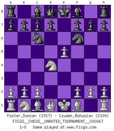 Last move : 1-0 2023 August 26 1:56:10 [Event "FICGS__CHESS__UNRATED_TOURNAMENT__000067"] [Site "FICGS"] [Date "2023.07.10"] [Round "1"] [White "Foster,Duncan"] [Black "Czudek,Bohuslav"] [Result "1-0"] [WhiteElo "1917"] [BlackElo "2104"] 1.e4 e5 2.Nf3 Nc6 3.d4 exd4 4.Nxd4 Nf6 5.e5 1-0 This chess game has been lost on time (started : 2023.07.10 21:49:28) Follow this game move after move (download)For surely of all the drugs in the world, Chess must be the most permanently pleasurable. (Assiac) Schach ist Kampf, hauptsächlich jedoch gegen die eigenen Fehler. (Savielly Grigorievitsch Tartakower) Sin errores no puede haber brillantez. (Emanuel Lasker) Les erreurs sont comme les malheurs, elles n'arrivent jamais seules. (Siegbert Tarrasch) When you don't know what to do, walk fast and look worried. (Anonymous)