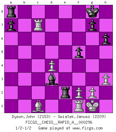Last move : 1/2-1/2 2023 September 24 11:57:2 [Event "FICGS__CHESS__RAPID_A__000296"] [Site "FICGS"] [Date "2023.07.11"] [Round "1"] [White "Dyson,John"] [Black "Swiatek,Janusz"] [Result "1/2-1/2"] [WhiteElo "2153"] [BlackElo "2209"] 1.e4 e5 2.Nf3 Nc6 3.Bc4 Nf6 4.Ng5 d5 5.exd5 Na5 6.Bb5+ c6 7.dxc6 bxc6 8.Bd3 Nd5 9.Nf3 Bd6 10.Nc3 f5 11.Nxd5 cxd5 12.b4 Nc6 13.Bb5 Bb7 14.Bb2 O-O 15.Bxc6 Bxc6 16.Nxe5 Re8 17.d4 Bxb4+ 18.c3 Bd6 19.O-O Bxe5 20.dxe5 Rxe5 21.Bc1 d4 22.Qxd4 Qxd4 23.cxd4 Re4 24.Bb2 Re2 25.Bc1 Re4 26.Bb2 Bd5 27.Rac1 Bxa2 28.Rc7 Bd5 29.h3 Re6 30.Kh2 h6 31.Rd7 Re2 32.Bc1 Be6 33.Re7 Bc4 34.Rc7 Bd3 35.Rd1 Be4 36.Kg1 Bc2 37.Rf1 Bd3 1/2-1/2 Follow this game move after move (download)Botvinnik tried to take the mystery out of Chess, always relating it to situations in ordinary life. He used to call Chess a typical inexact problem similar to those which people are always having to solve in everyday life. (Garry Kasparov) Die Neutralität betrachte ich als eine schwere Krankheit. (Viktor Kortschnoi) Es muy difícil jugar en contra de la teoría de Einstein. - en su primera derrota en contra de Fischer (Mikhail Tal) Assurément je connaissais par expérience le mystérieux attrait de ce jeu royal, le seul entre tous les jeux inventés par les hommes qui échappe souverainement à la tyrannie du hasard, le seul où l'on ne doive sa victoire qu'à son intelligence ou plutôt à une certaine forme d'intelligence. Mais n'est-ce pas déjà le limiter injurieusement que d'appeler les échecs un jeu ? N'est-ce pas une science, un art ou quelque chose qui, comme le cercueil de Mahomet entre ciel et terre, est suspendu entre l'un et l'autre, et qui réunit un nombre incroyable de contraires ? [...] C'est une pensée qui ne mène à rien, une mathématique qui n'établit rien, un art qui ne laisse pas d'uvre, une architecture sans matière; et il l'a prouvé néanmoins qu'il était plus durable, à sa manière, que les livres ou que tout autre monument, ce jeu unique qui appartient à tous les peuples et à tous les temps, et dont personne ne sait quel dieu en fit don à la terre pour tuer l'ennui, pour aiguiser l'esprit et stimuler l'âme. Où commence-t-il, où finit-il ? (Stefan Zweig) This is where the fun begins. (Anakin Skywalker in Star Wars ep.3)