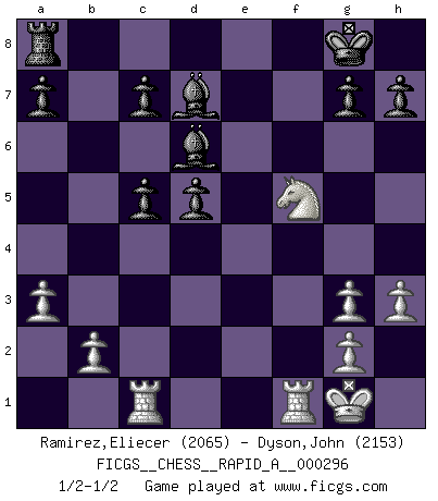 Last move : 1/2-1/2 2023 September 16 16:53:37 [Event "FICGS__CHESS__RAPID_A__000296"] [Site "FICGS"] [Date "2023.07.11"] [Round "1"] [White "Ramirez,Eliecer"] [Black "Dyson,John"] [Result "1/2-1/2"] [WhiteElo "2065"] [BlackElo "2153"] 1.e4 e5 2.Nf3 Nc6 3.Bc4 Bc5 4.c3 Nf6 5.d4 exd4 6.e5 d5 7.Be2 Ne4 8.cxd4 Bb4+ 9.Bd2 Nxd2 10.Nbxd2 O-O 11.O-O f6 12.Nb3 Re8 13.a3 Bf8 14.Bb5 Bg4 15.Bxc6 bxc6 16.Rc1 fxe5 17.dxe5 Rxe5 18.Nbd4 Qe8 19.Qd3 c5 20.Nxe5 Qxe5 21.h3 Bd6 22.Qg3 Qxg3 23.fxg3 Bd7 24.Nf5 1/2-1/2 Follow this game move after move (download)Pawns: they are the soul of this game, they alone form the attack and defense. (Philidor) Stil? Ich habe keinen Stil! (Anatoly Karpov) La mitad de las variaciones que son calculadas en una partida de torneo, resultan ser completamente superfluas. Desafortunadamente, nadie sabe por adelantado cual mitad. (Jan Tinman) La tactique est l'élément le plus important du milieu de jeu. (Siegbert Tarrasch) He who is a good ruler must first have been ruled. (Aristotle)